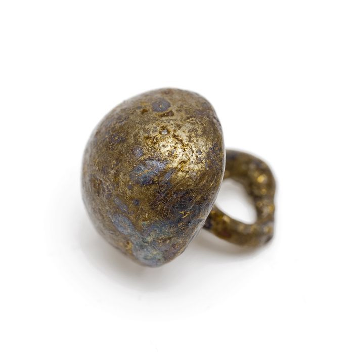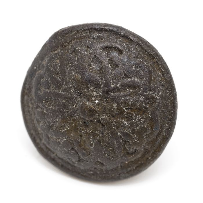 Metalen knoop met vast oog, in reliëf een bloemfiguur