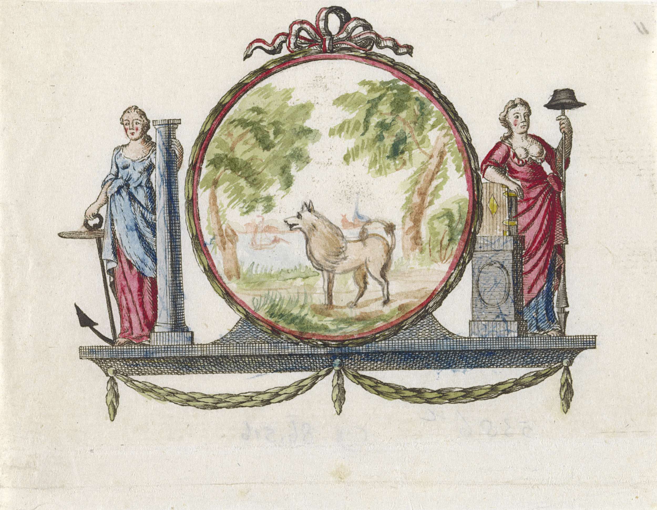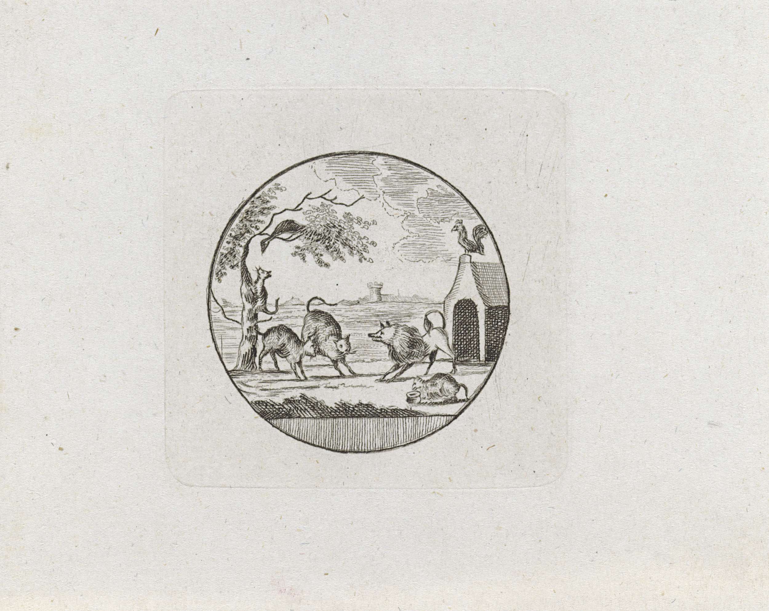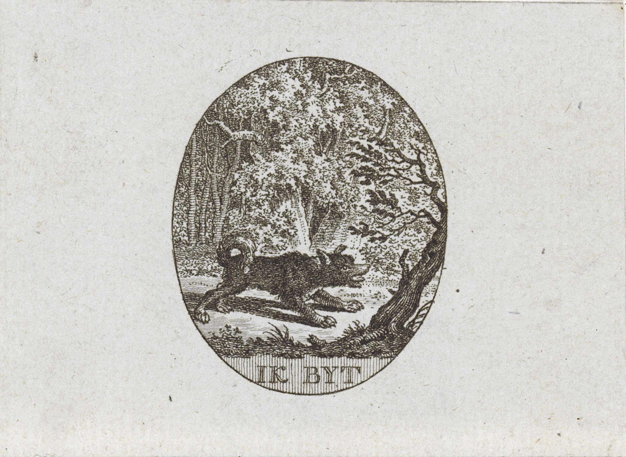 Vignet met keeshond dat zijn hok verdedigt, ca. 1787...