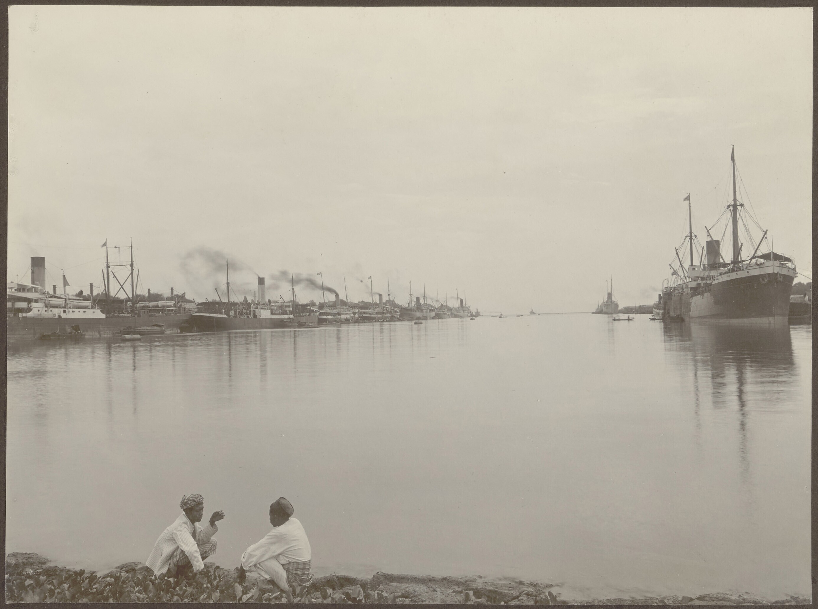 Schepen langs de kade in de haven van Tandjong Priok...