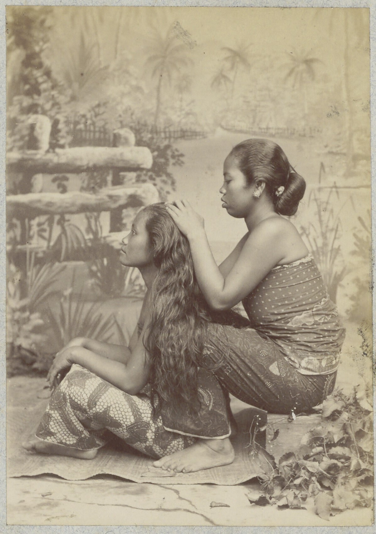 Studioportret van twee Javaanse vrouwen die elkaar o...