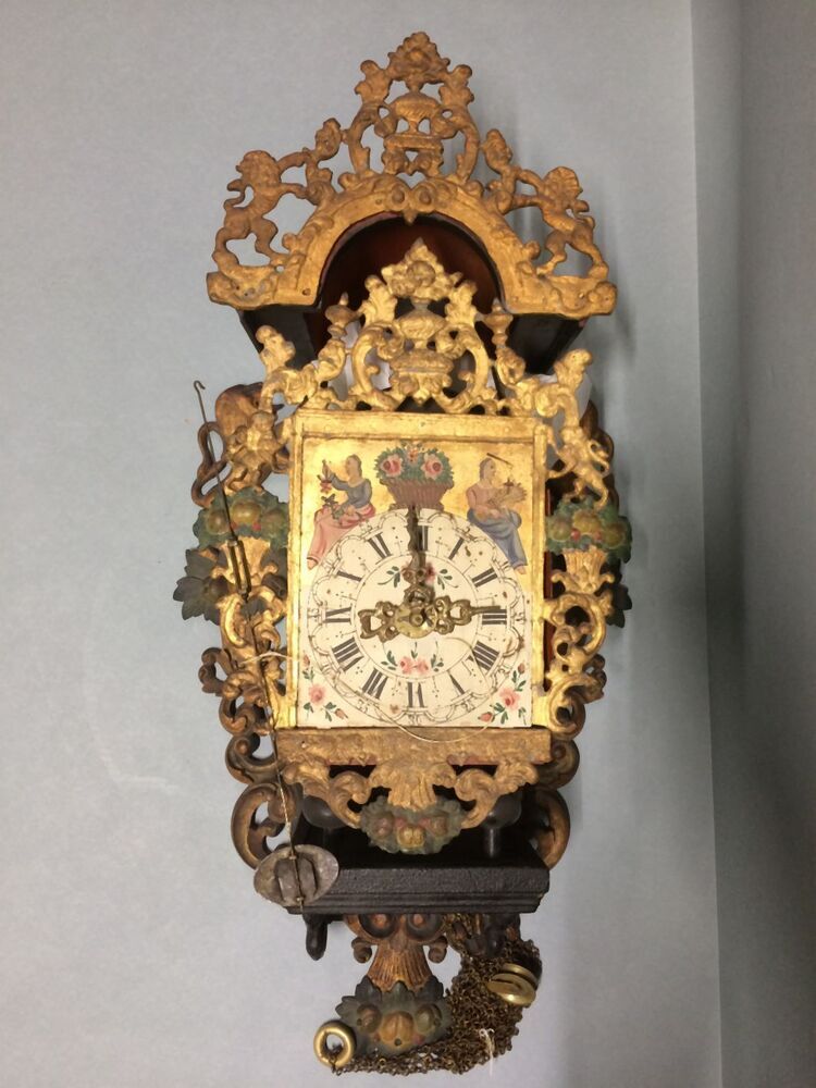 Stoeltjesklok met aan een der zijden een hoornblazen...