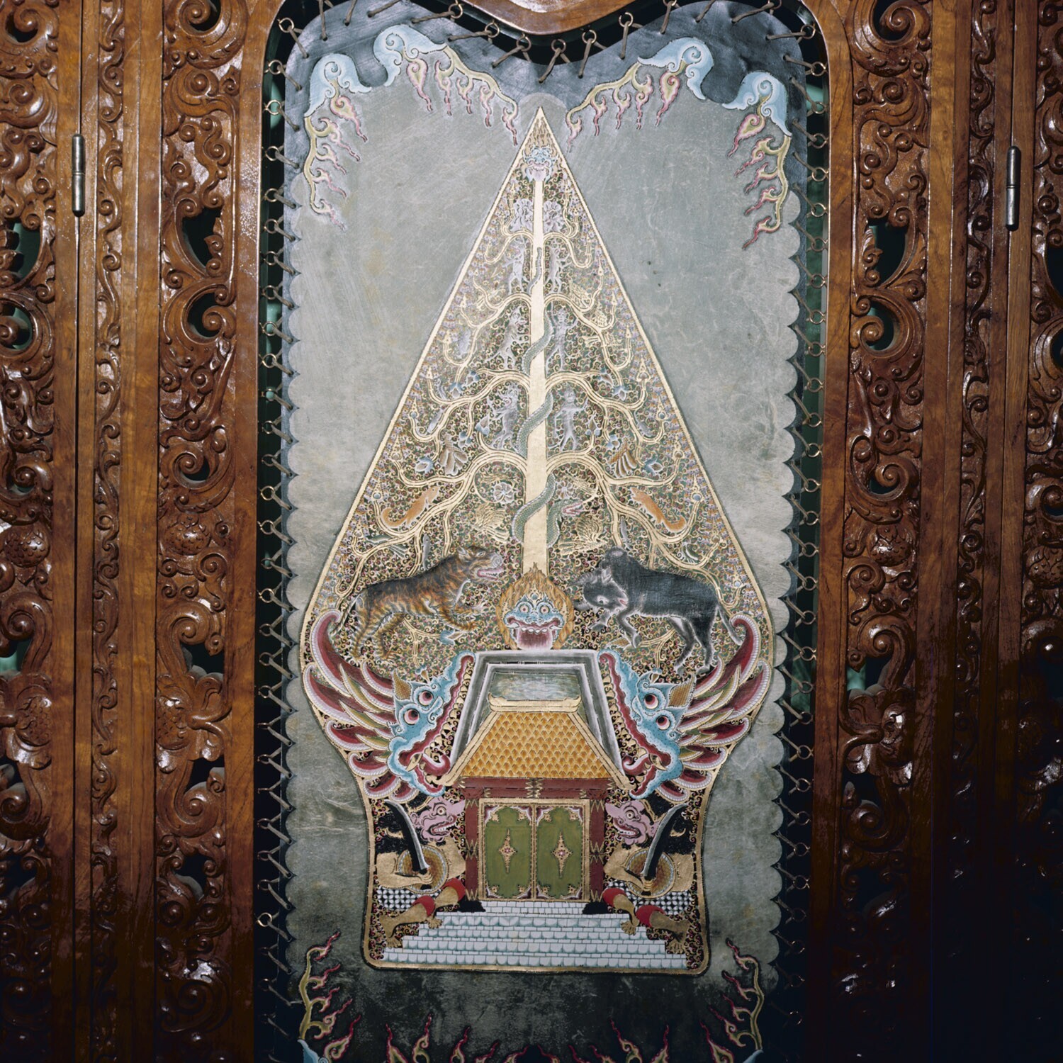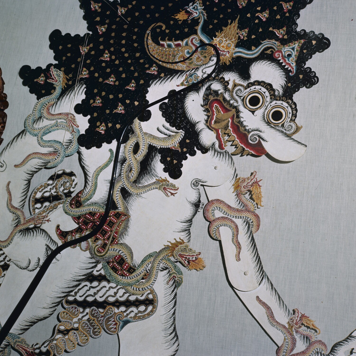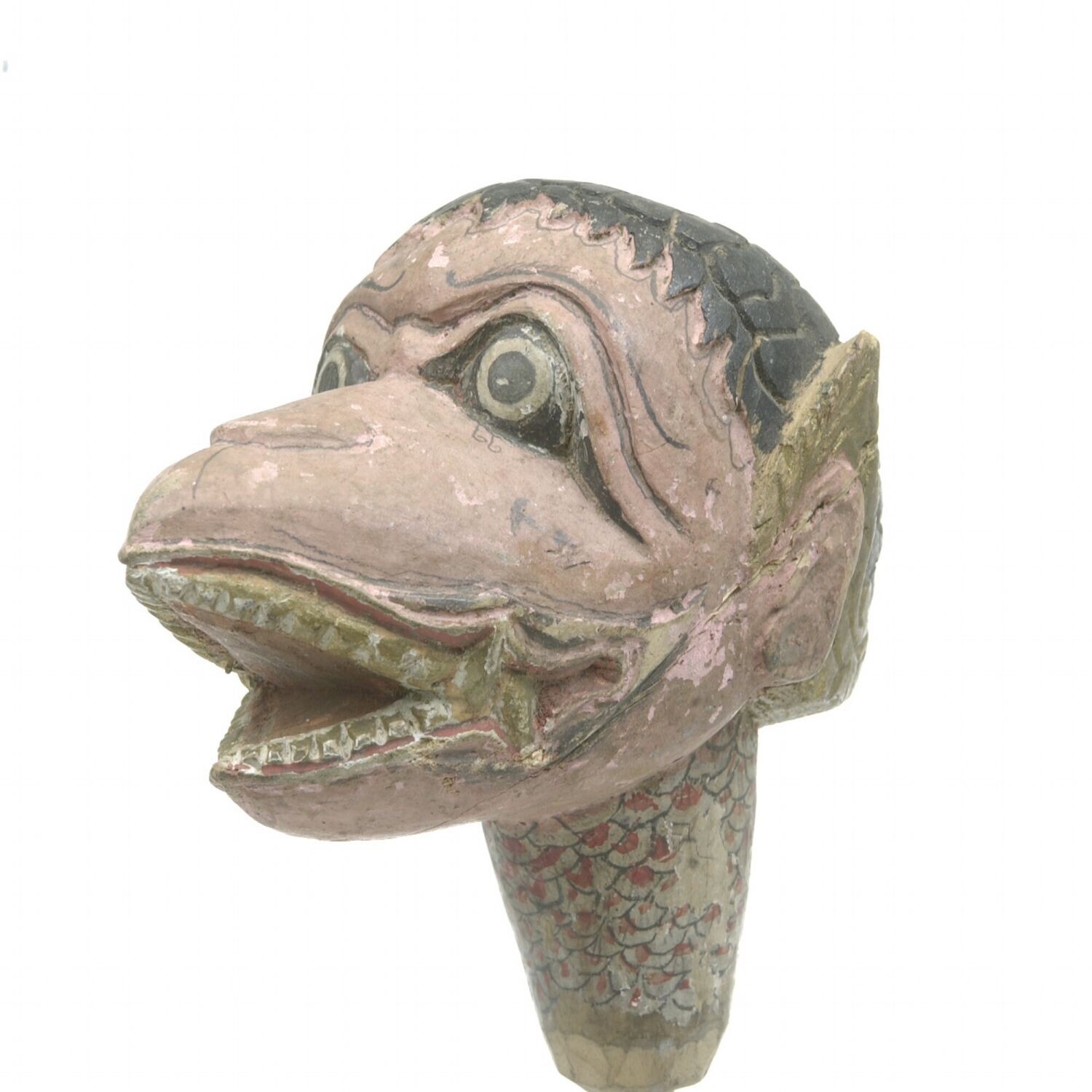Kop van een wajangpop: dierenkop met schubbenhals