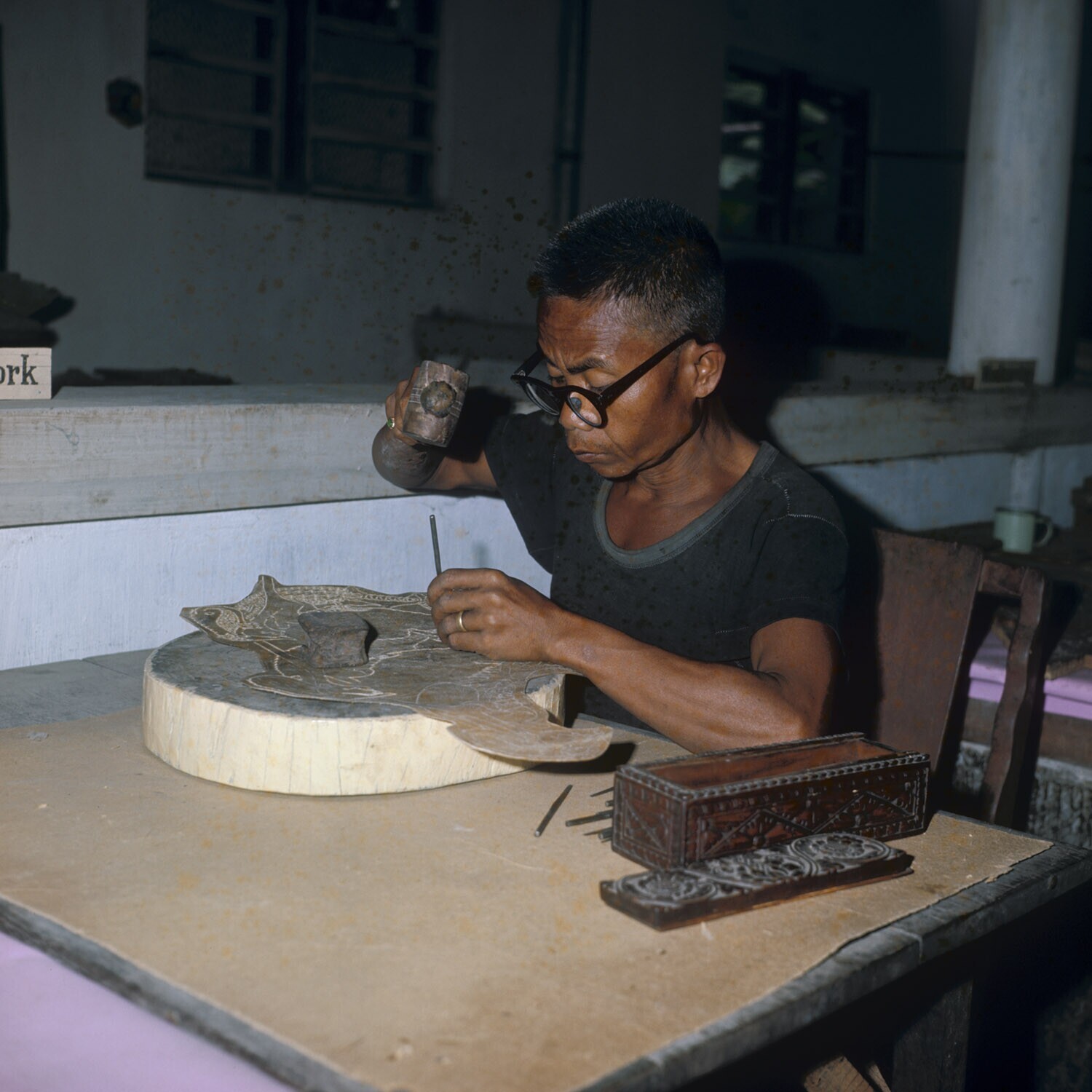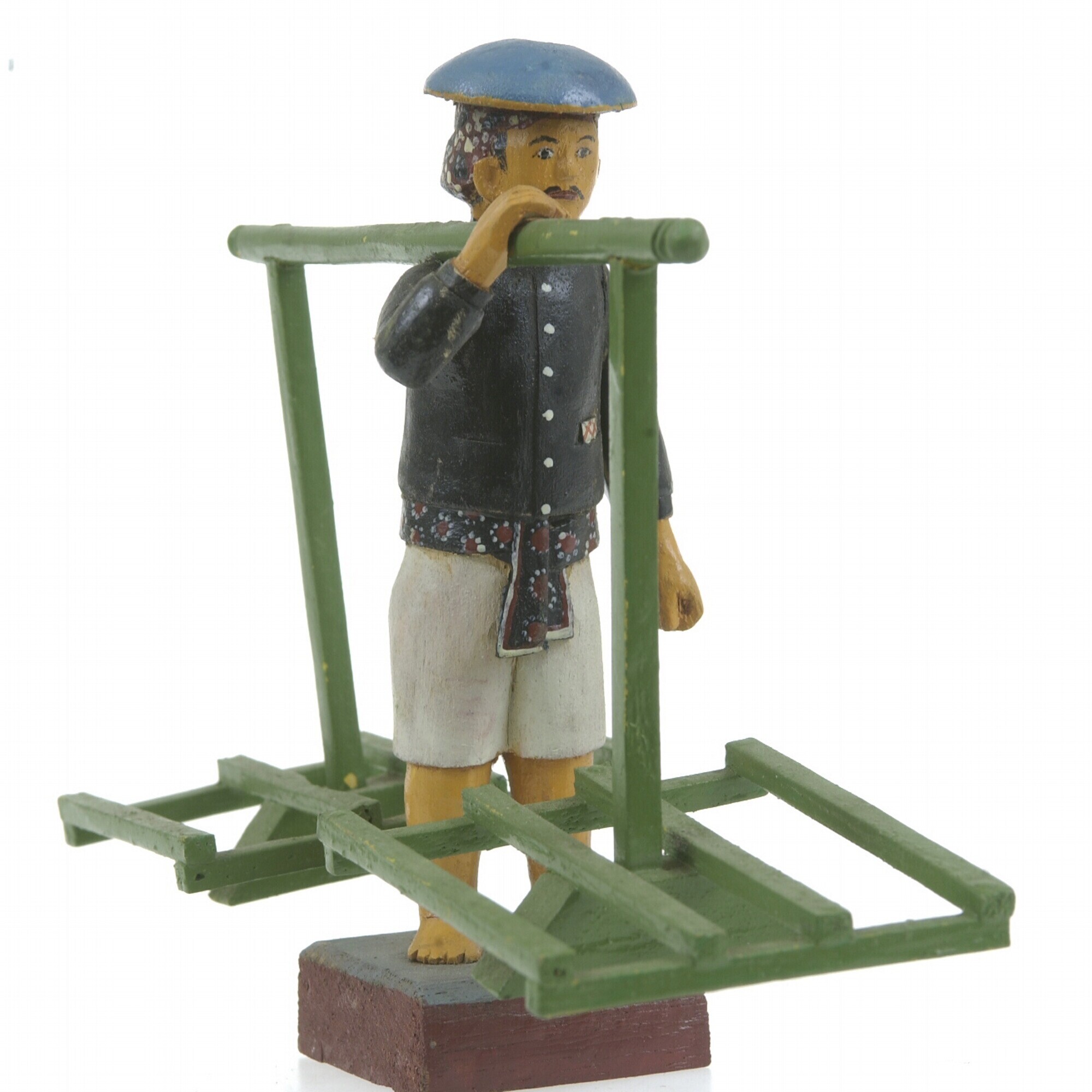 Beeld van een drager met draagstel, van hout, onderd...