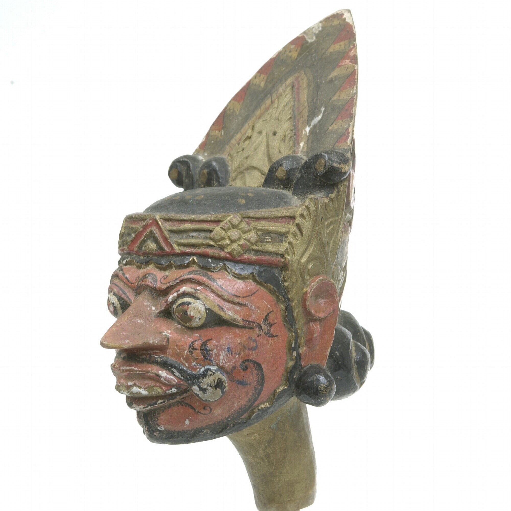 Kop van een wajangpop met kuluk-hoofddeksel