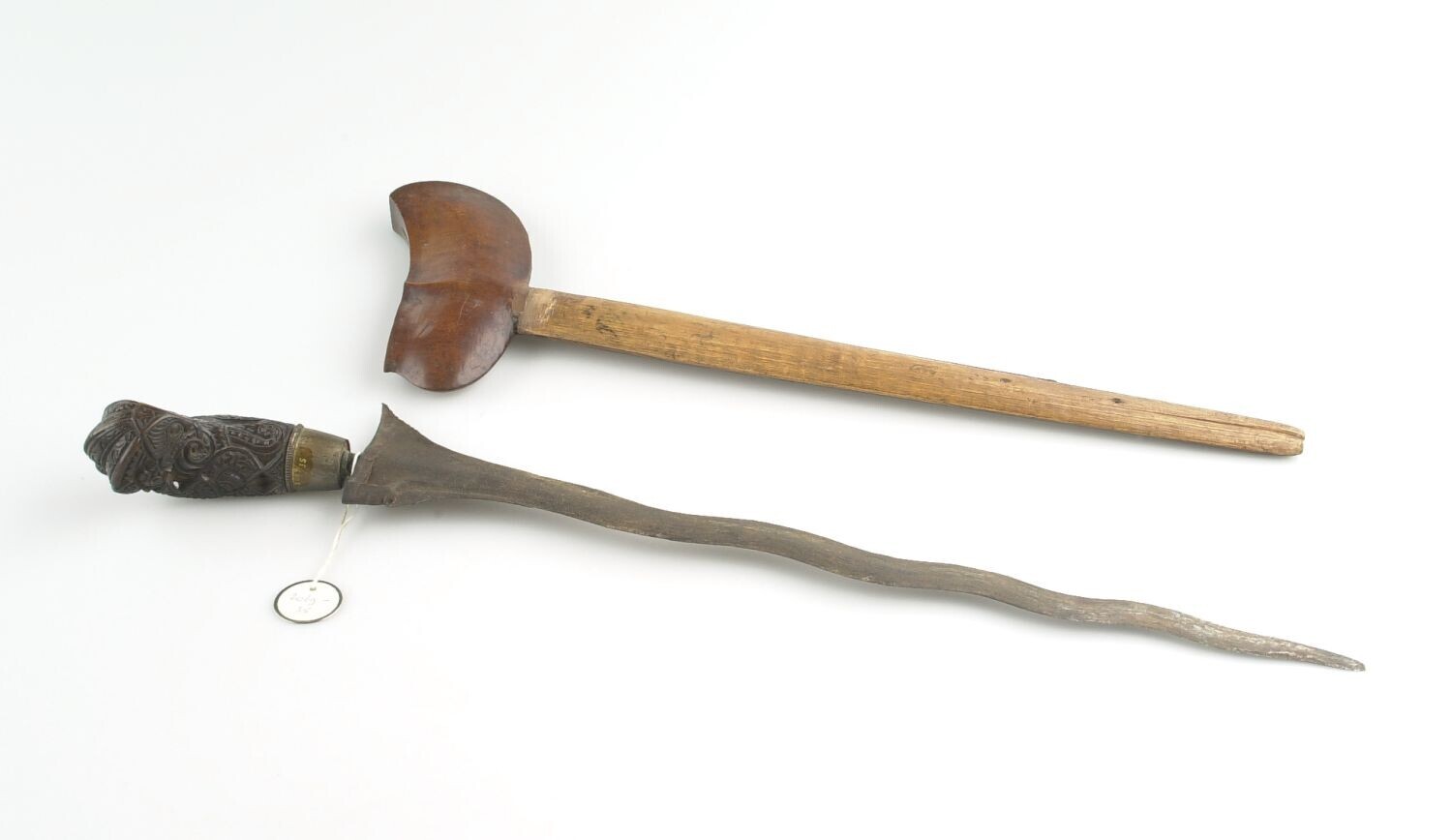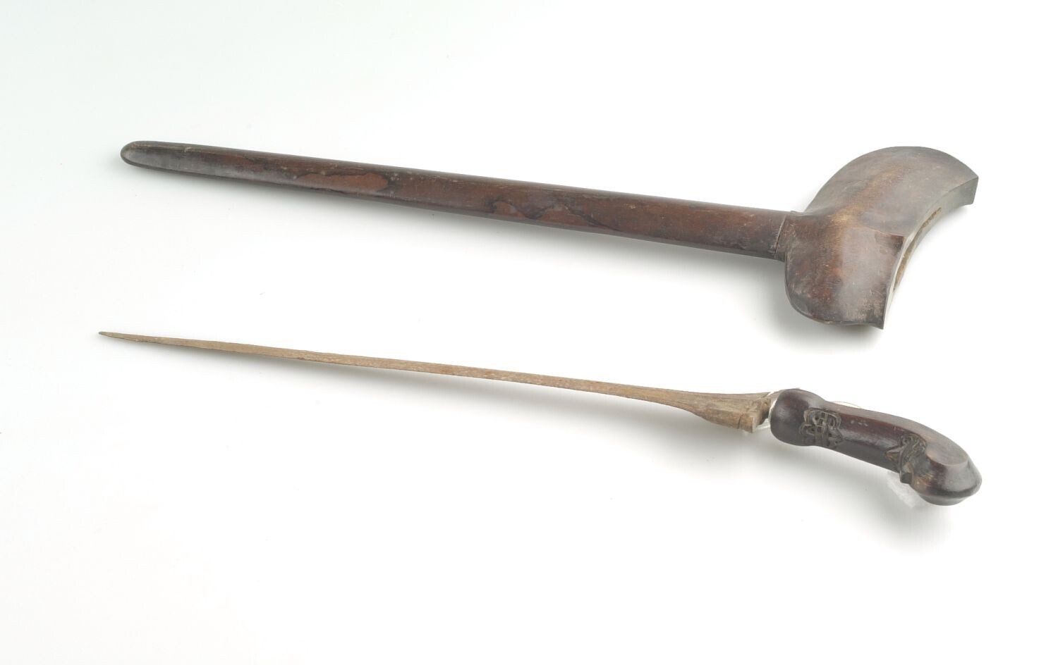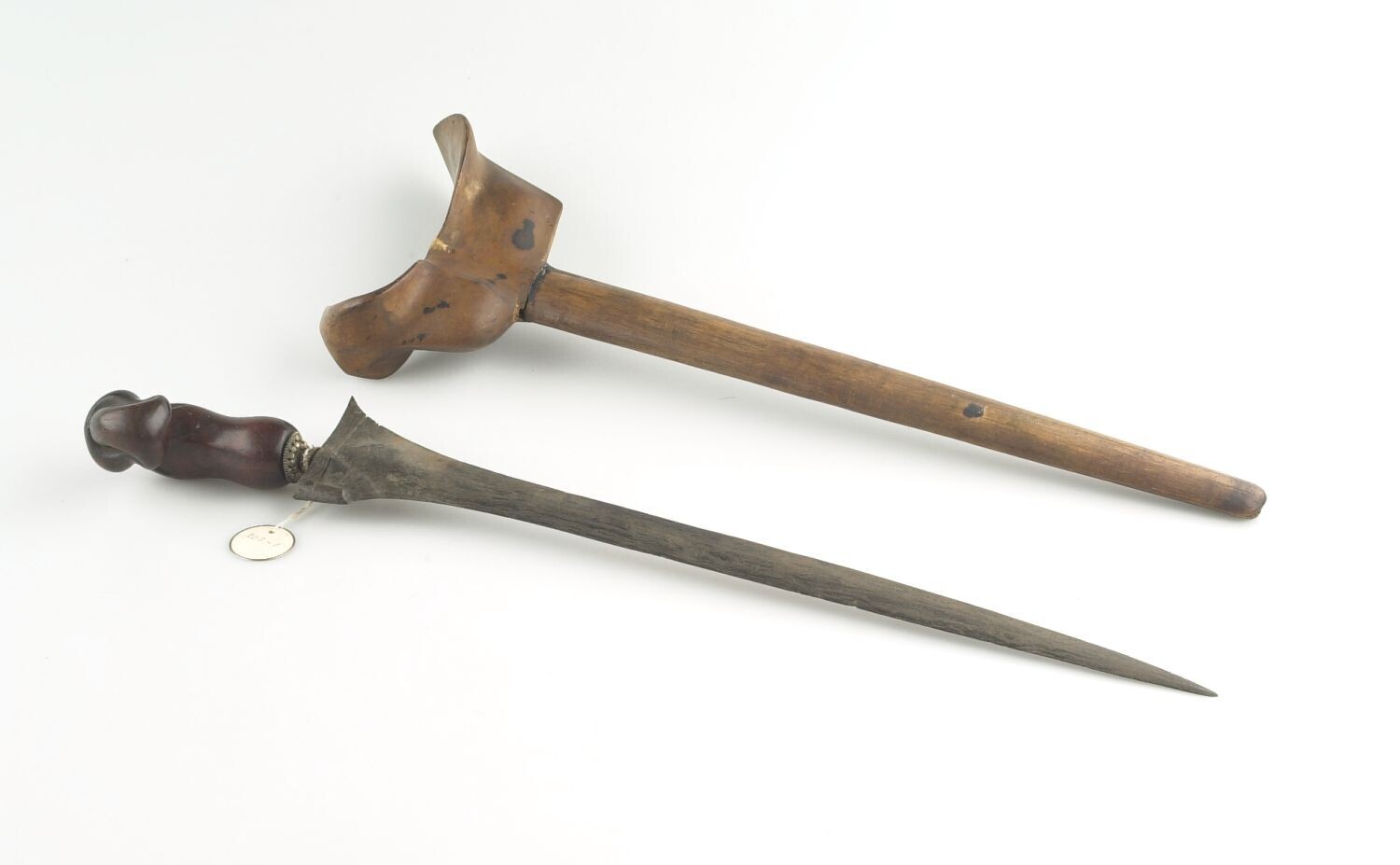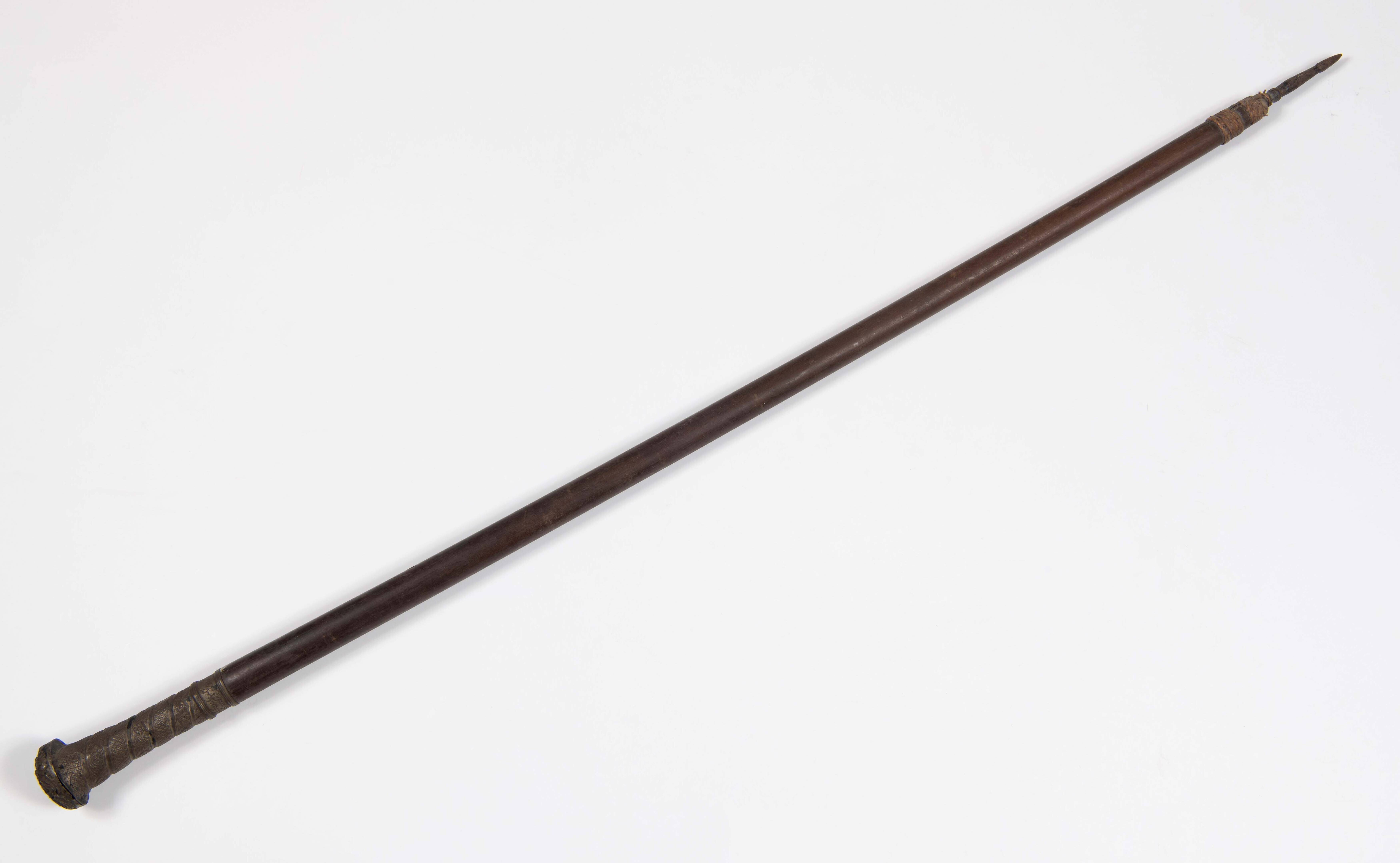 Houten stok met bewerkte zilverenknop en ijzeren punt
