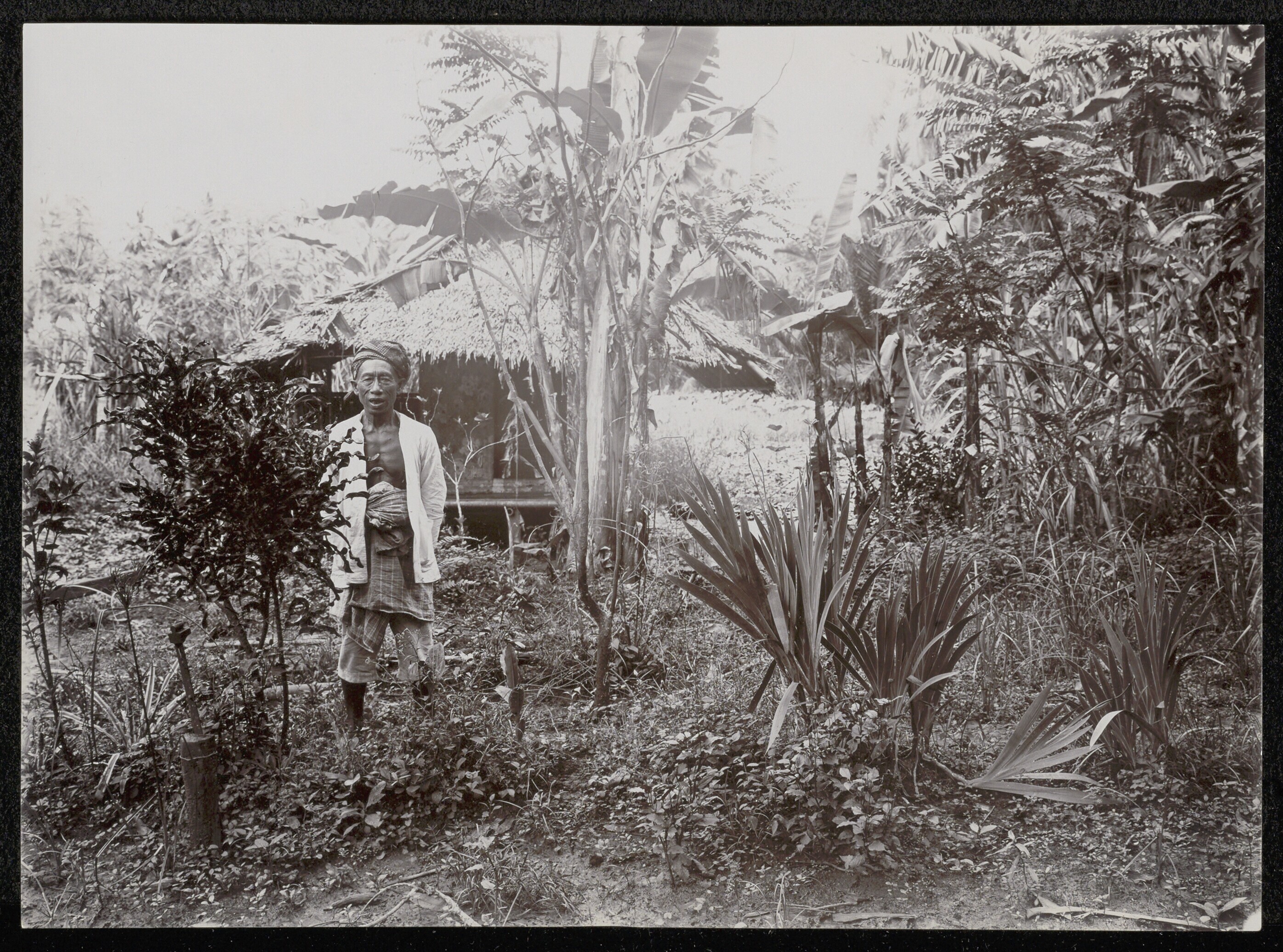 Een dukun in zijn tuin met geneeskrachtige planten n...