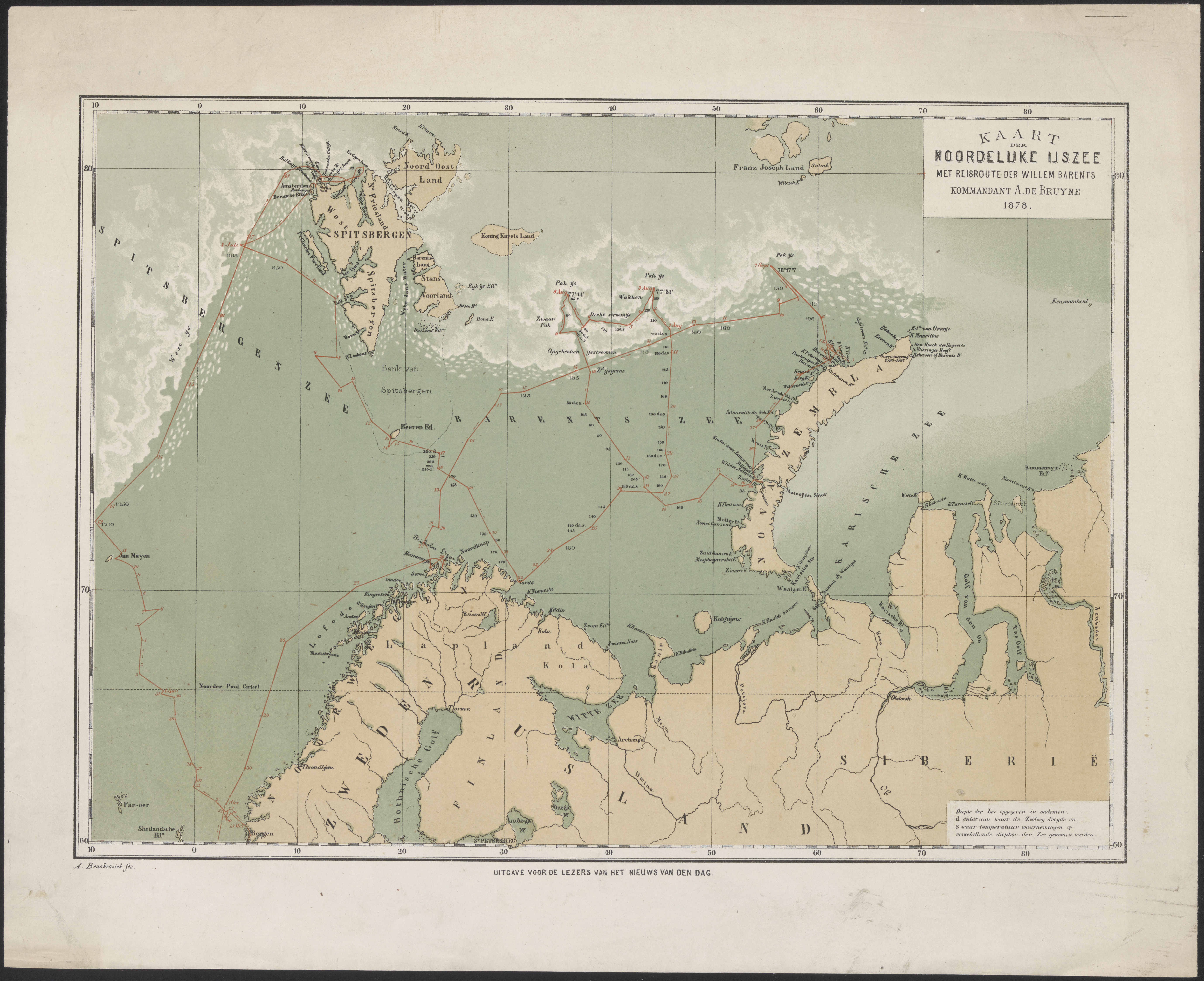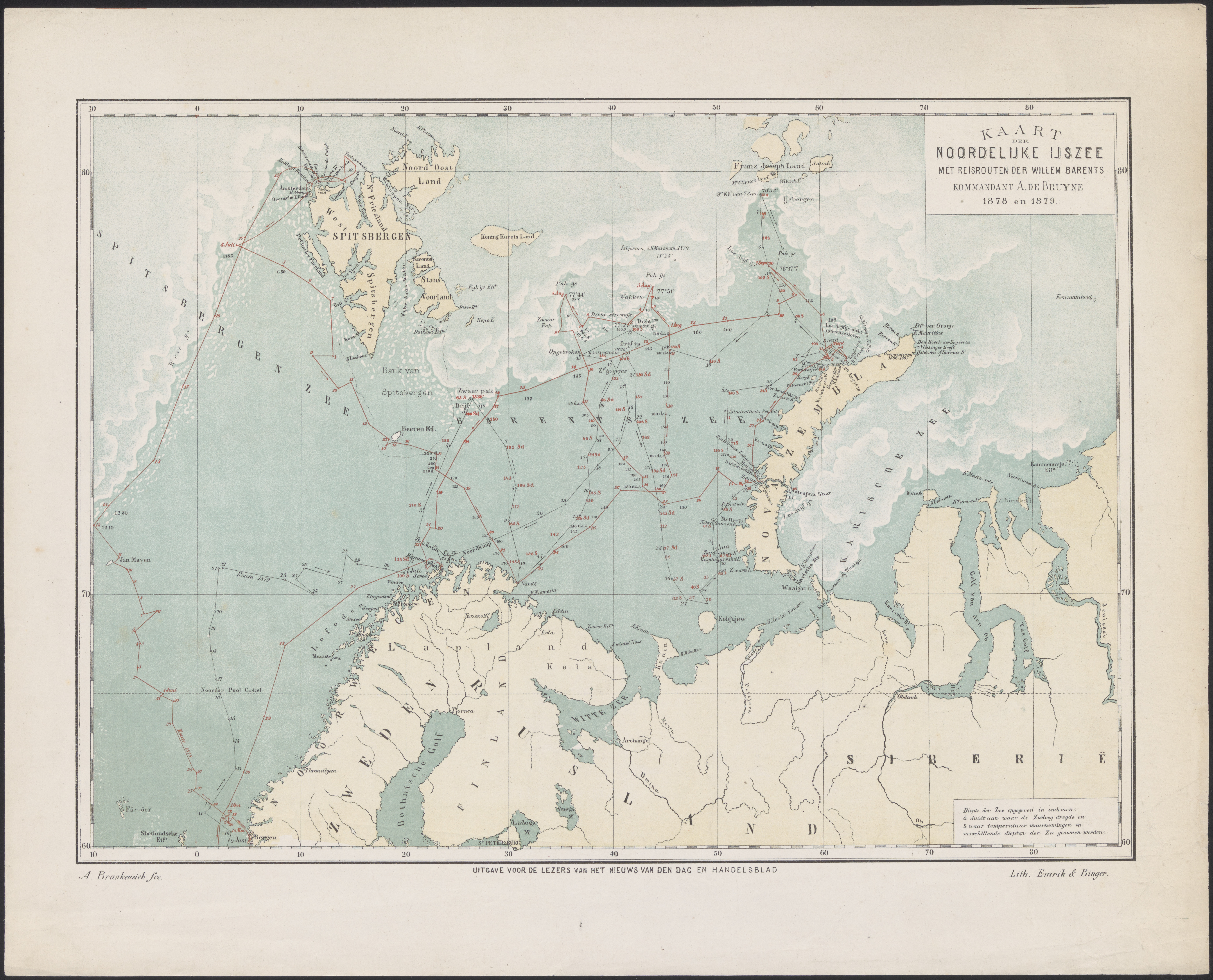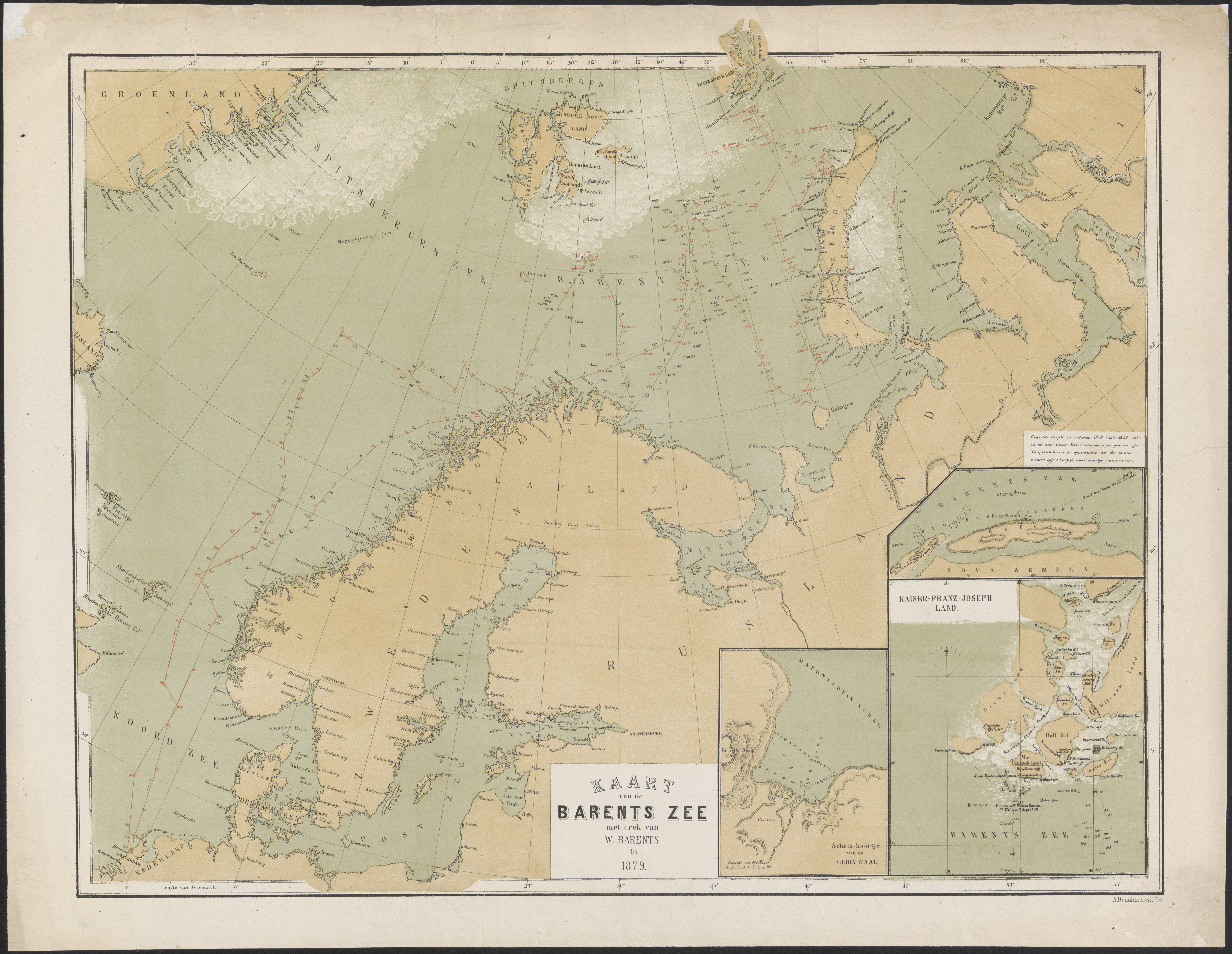 Kaart van de Barents Zee met trek van W. Barents en ...