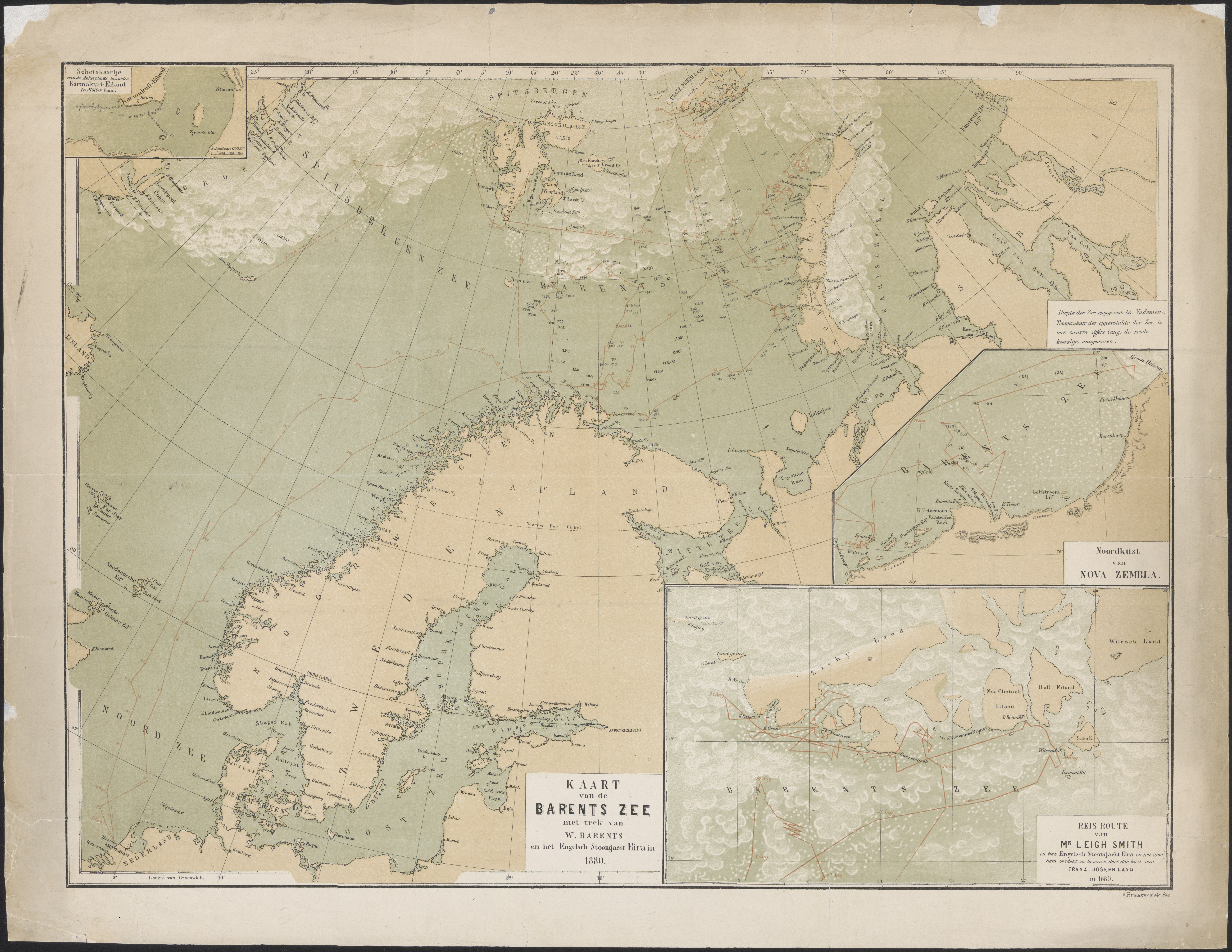 Kaart van de Barents zee met trek van W. Barents in ...