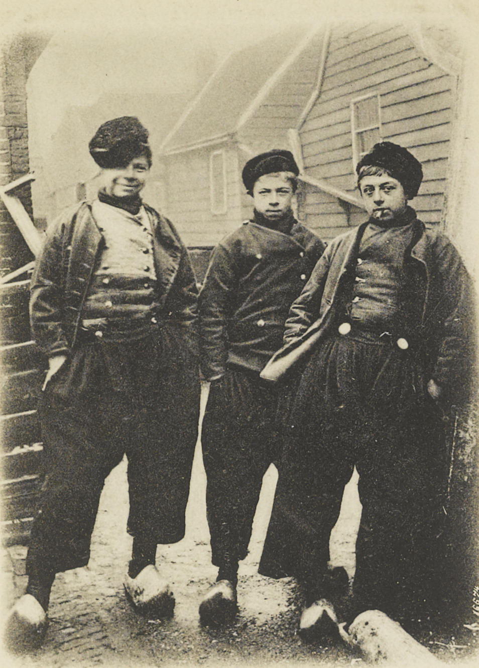 Drie jongens in dracht uit Volendam, circa 1900 (ans...