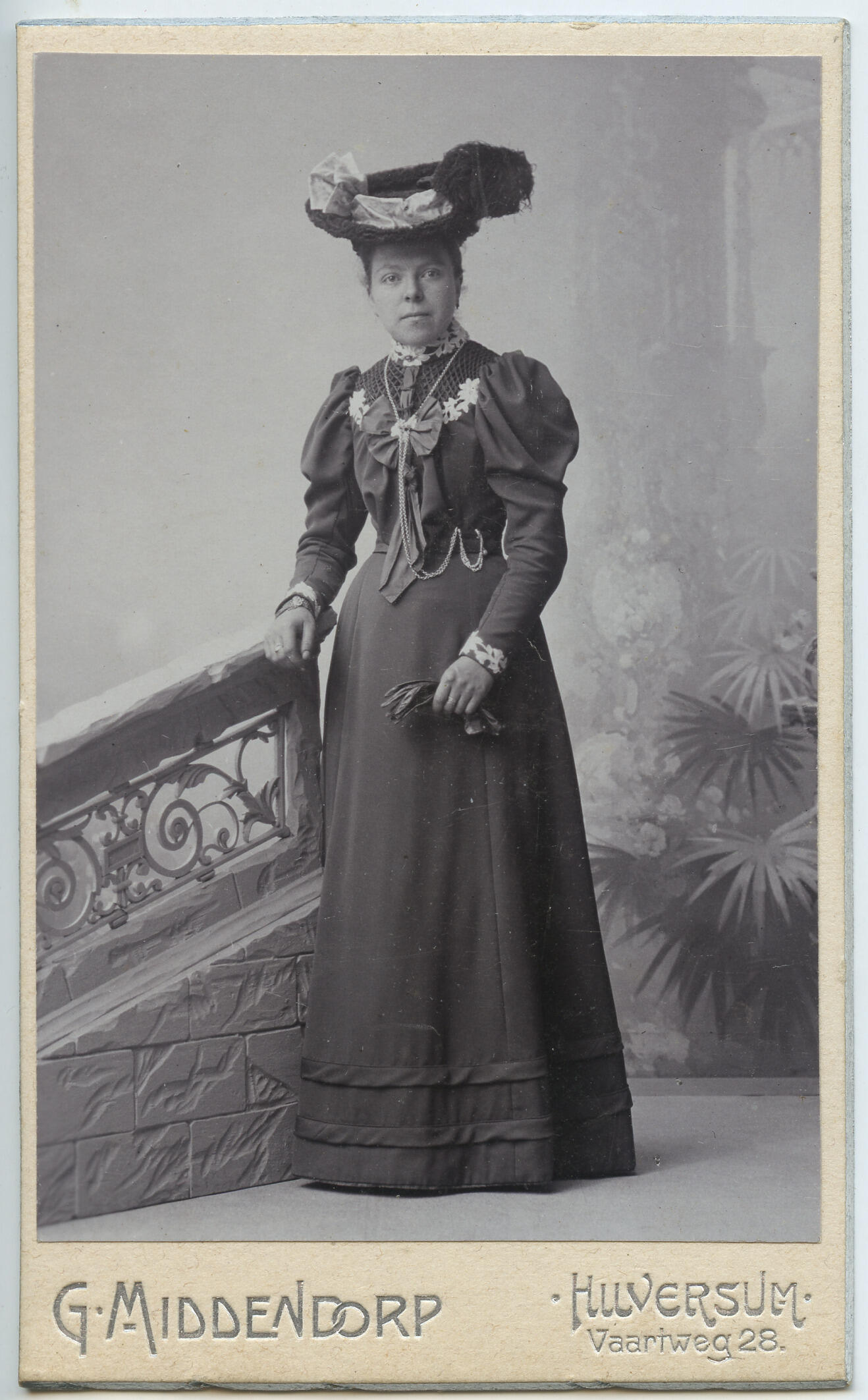 Vrouw in modedracht, circa 1900 (zwart-wit foto)