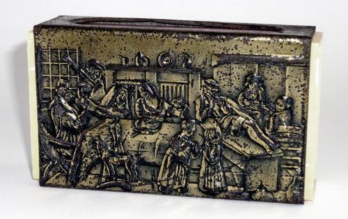 Sigaretten houder. Metalen afbeelding van een kuipe...