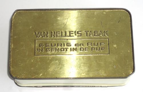 Pijptabak trommel. Metalen rechthoekig blik met iet...