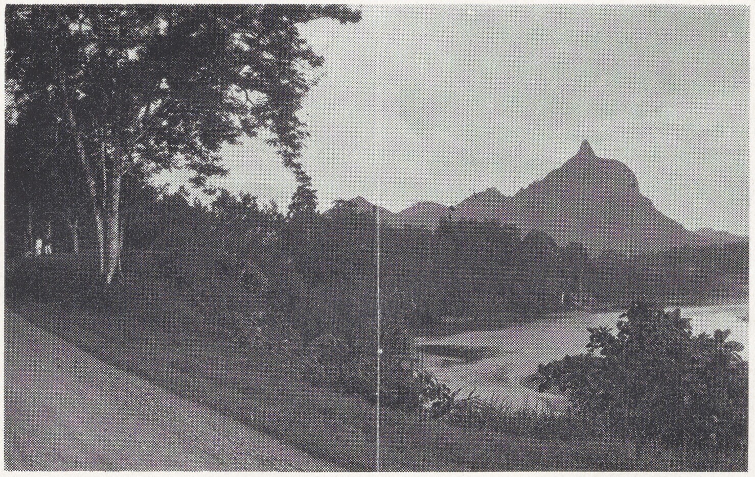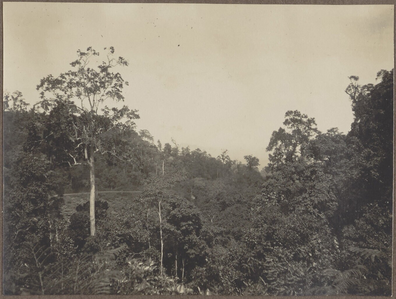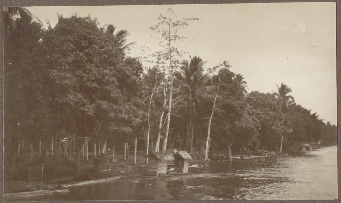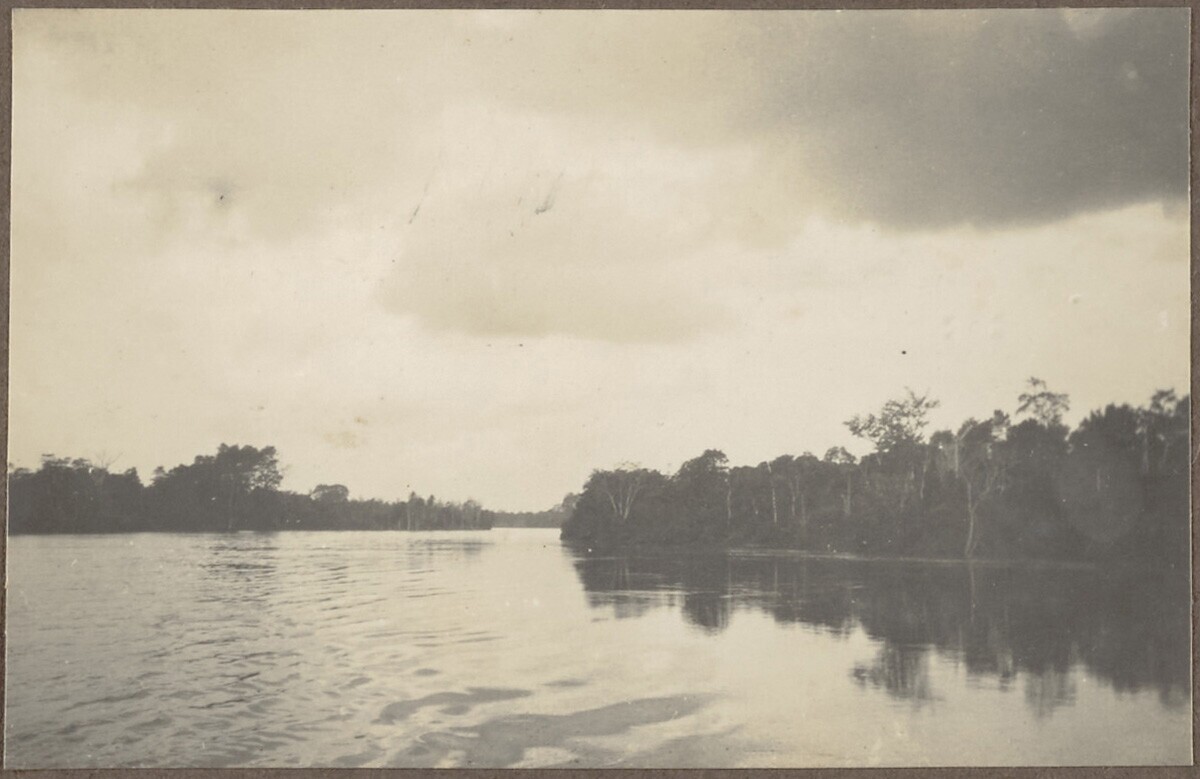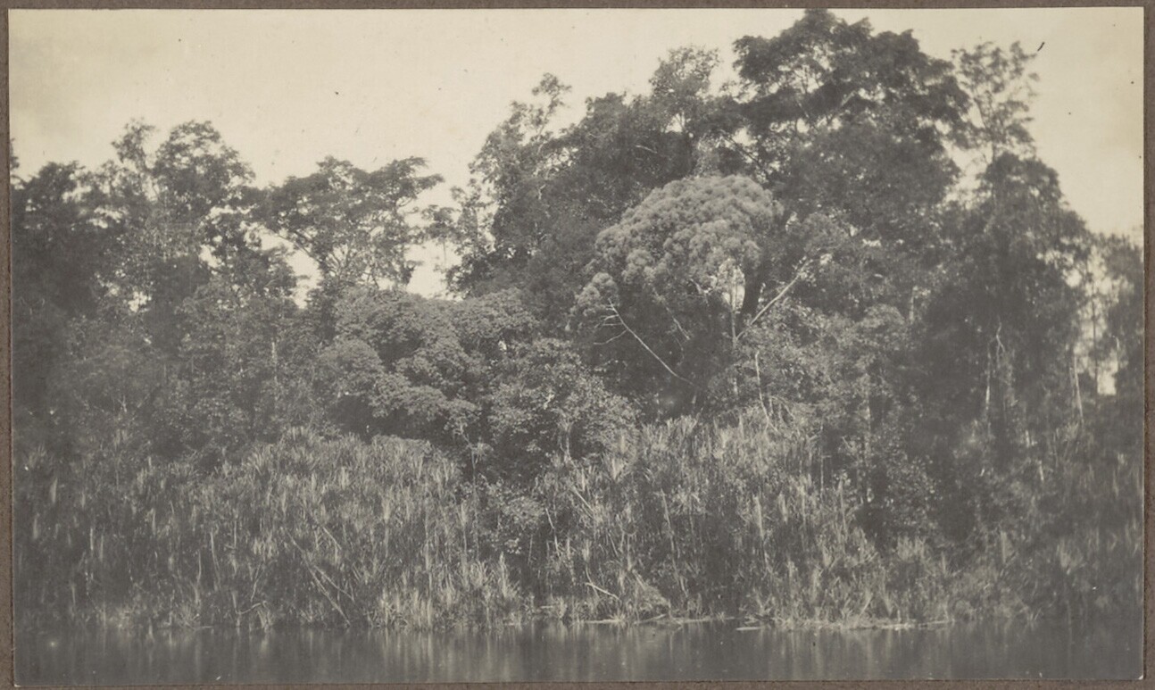 Pandanus en een bloeiende eik langs de rivier Lalan