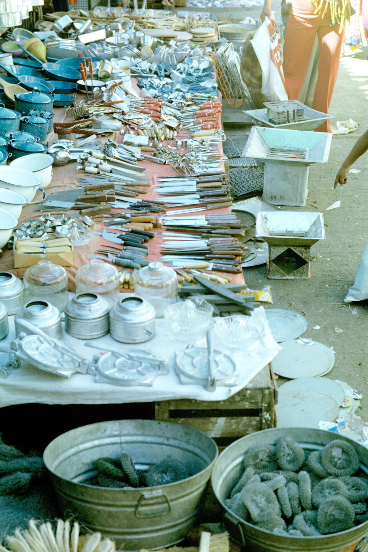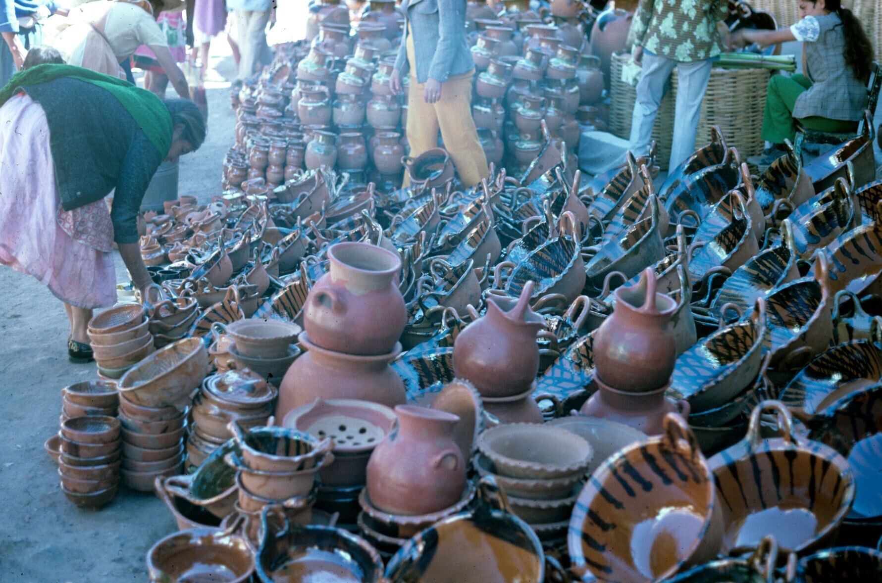 aardewerk op markt; kruiken, schalen en dierfiguurtjes