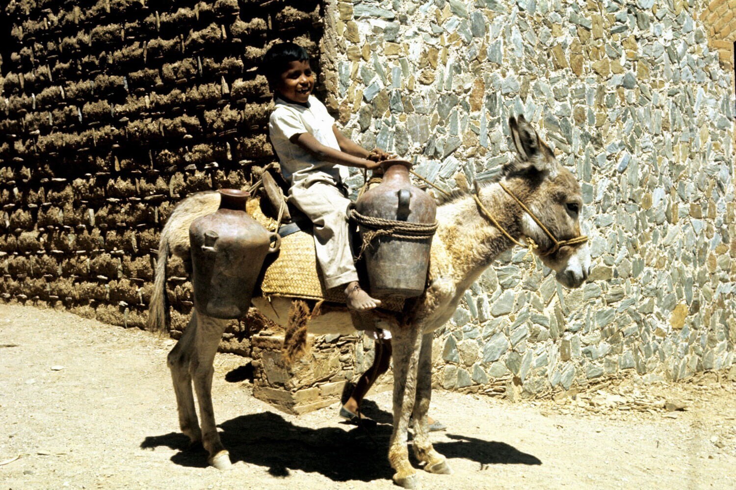 jongetje op ezel met waterkruiken, voor huis van pot...