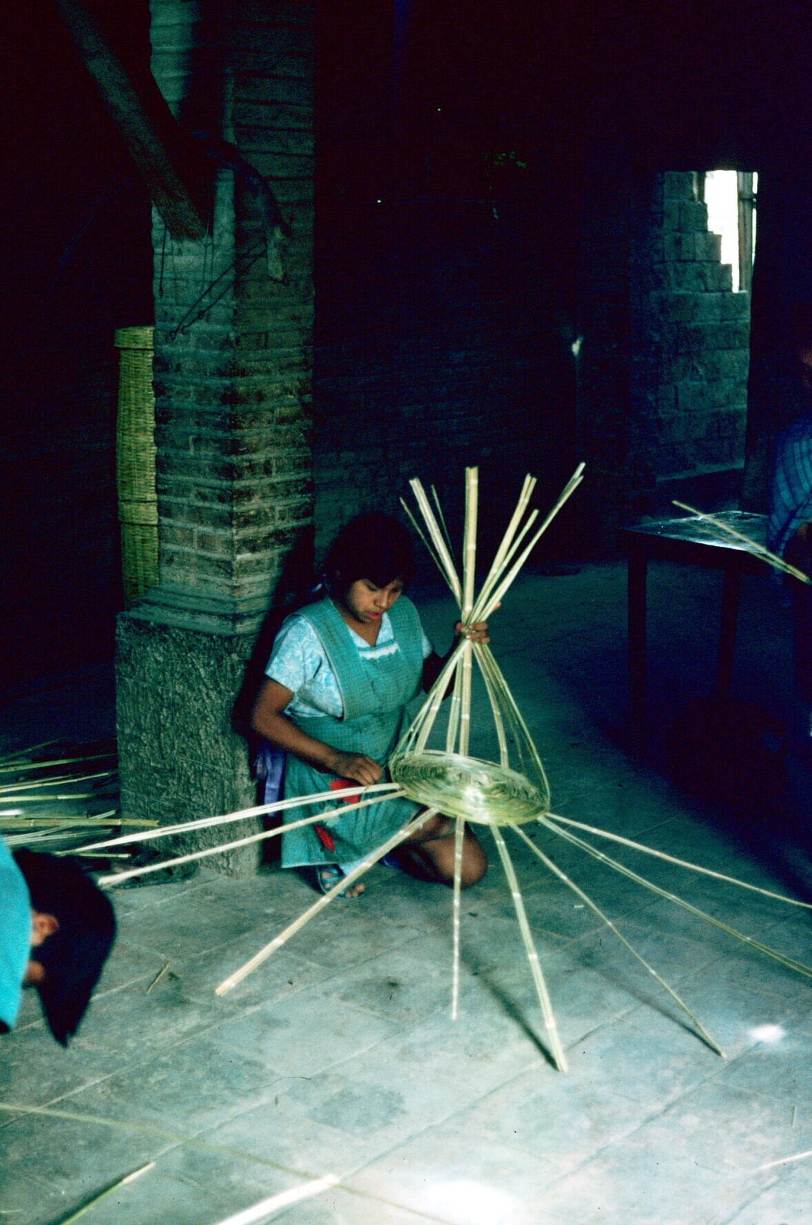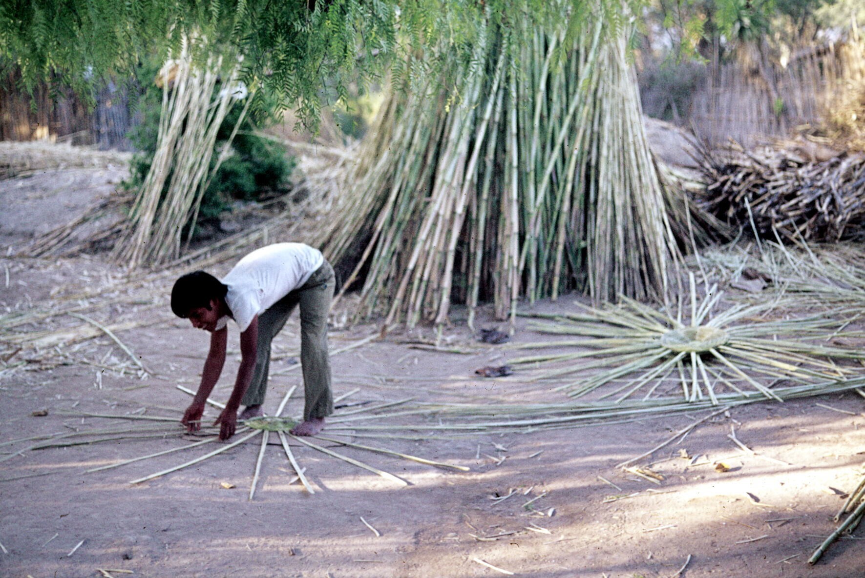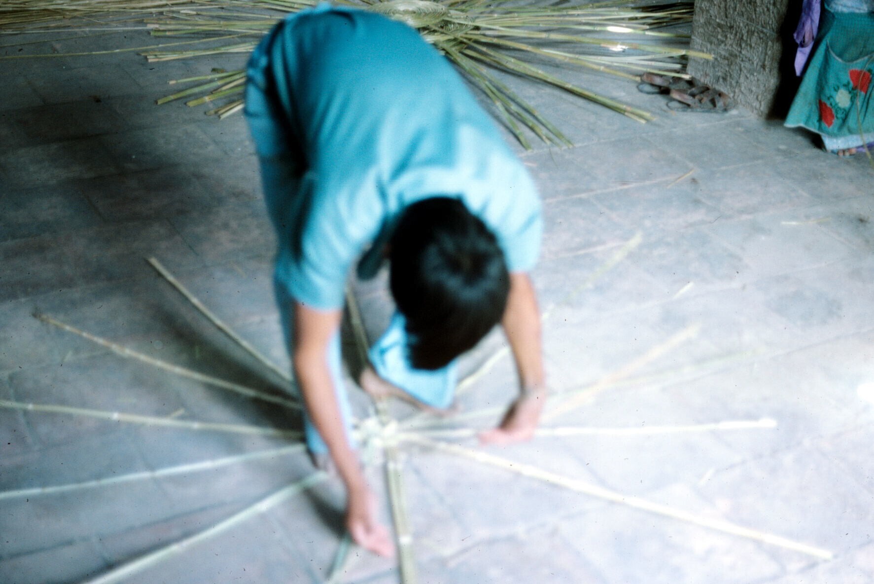 jongen, mand vlechtend op erf van tante zusjes Reyes