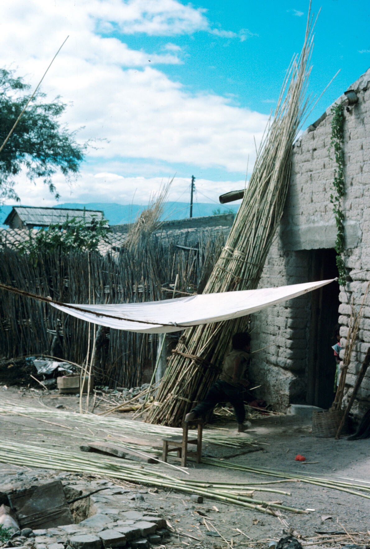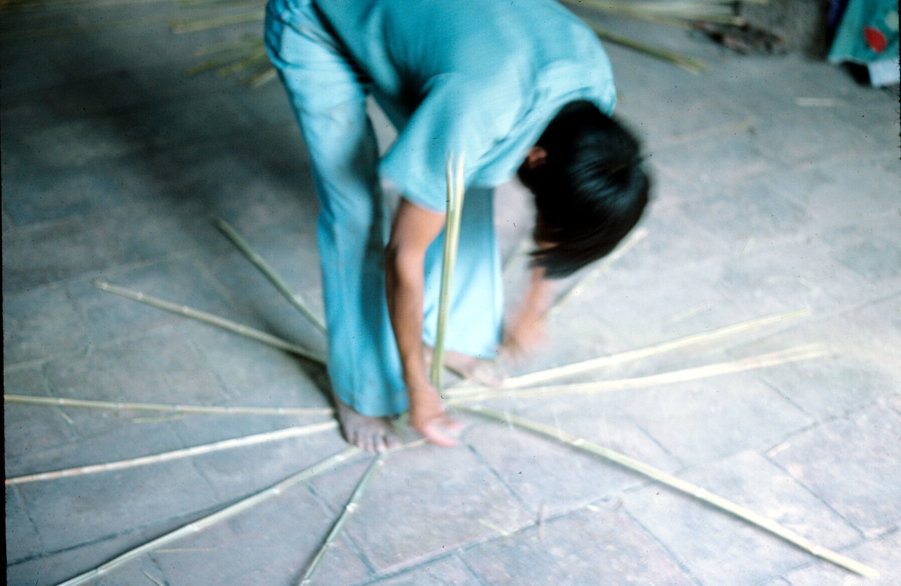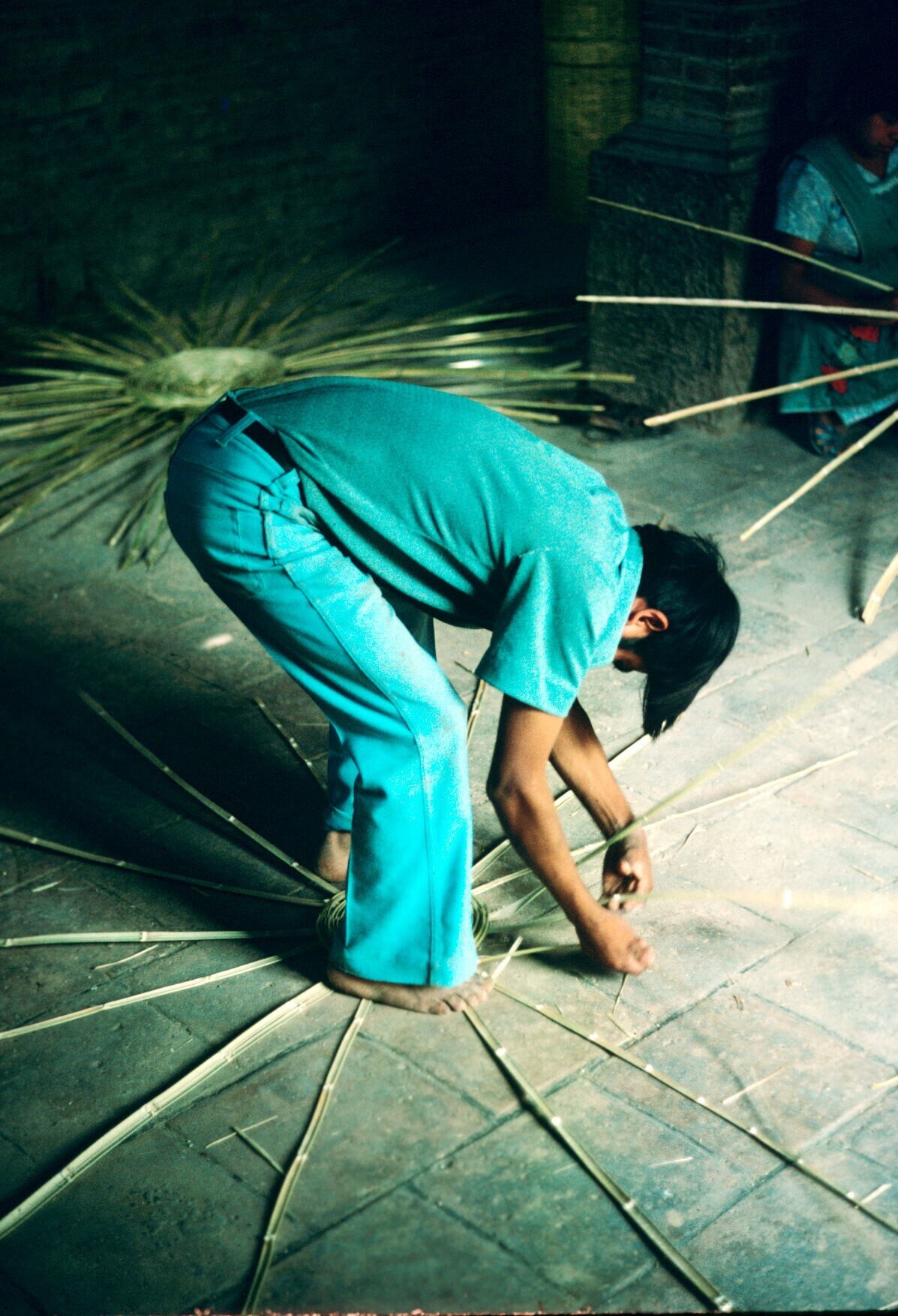 jongen, mand vlechtend op erf van tante zusjes Reyes