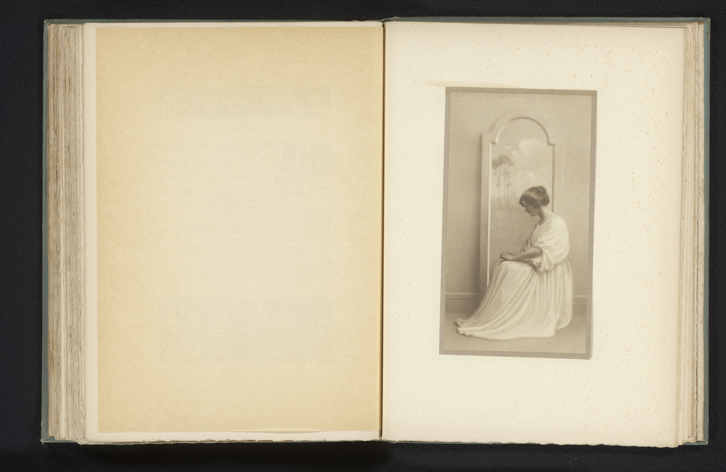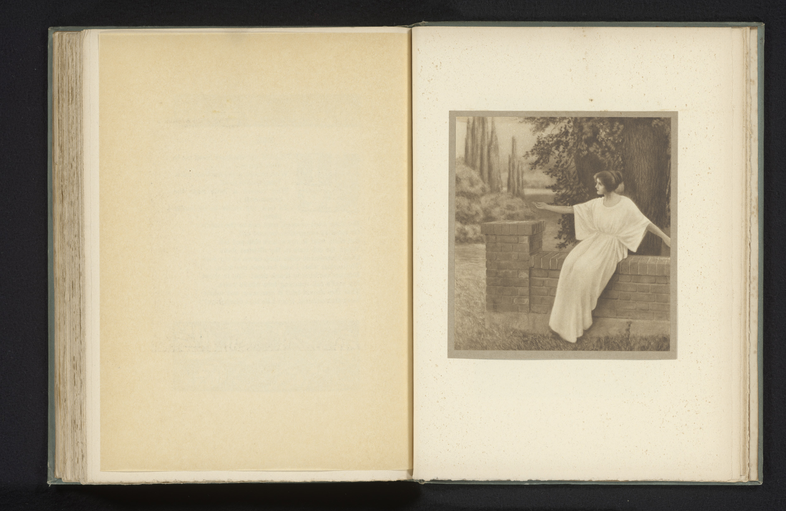 Vrouw met de handen ineen geslagen, aan weerszijden ...