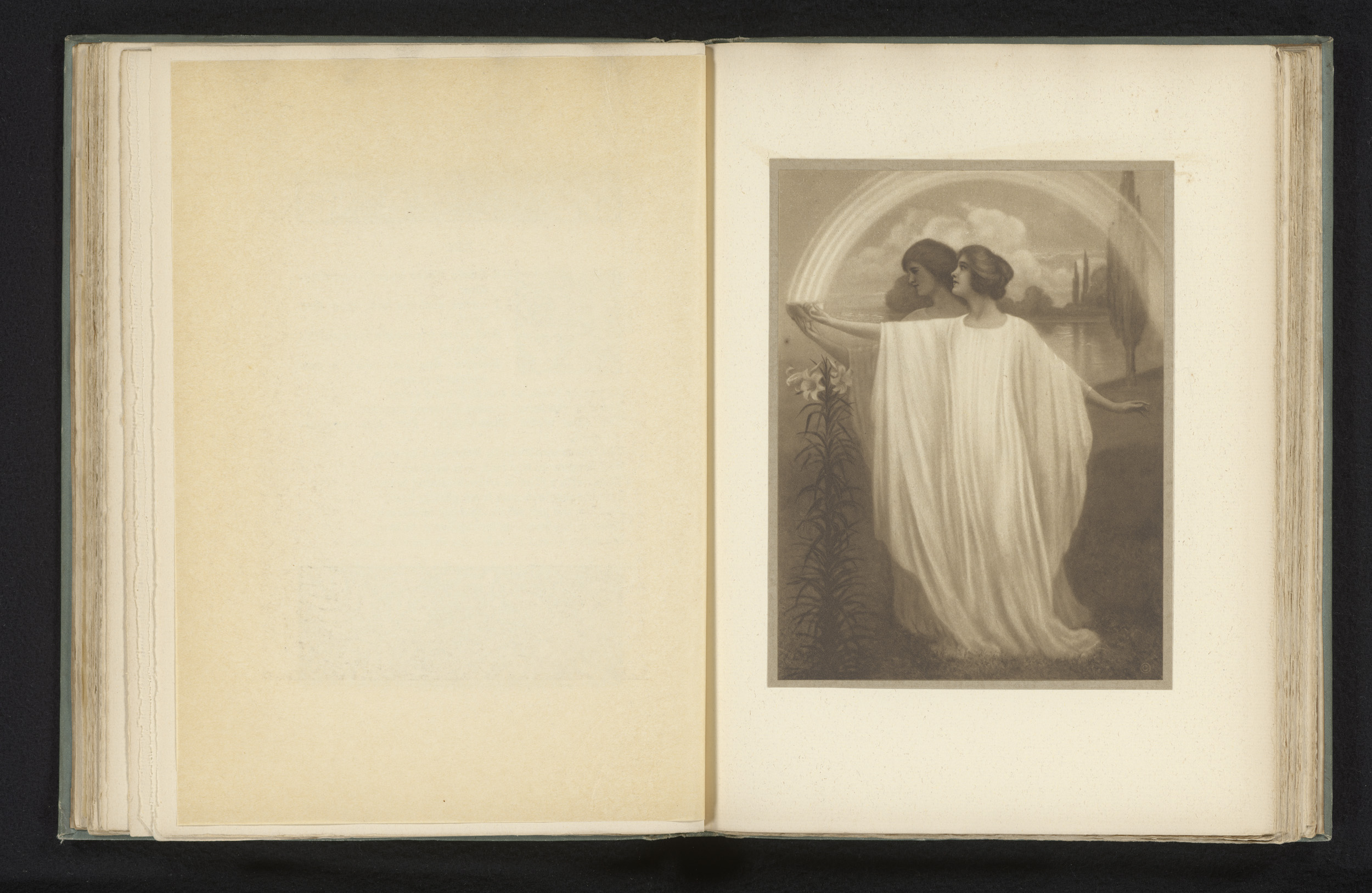 Twee vrouwen in een landschap met lelie en regenboog