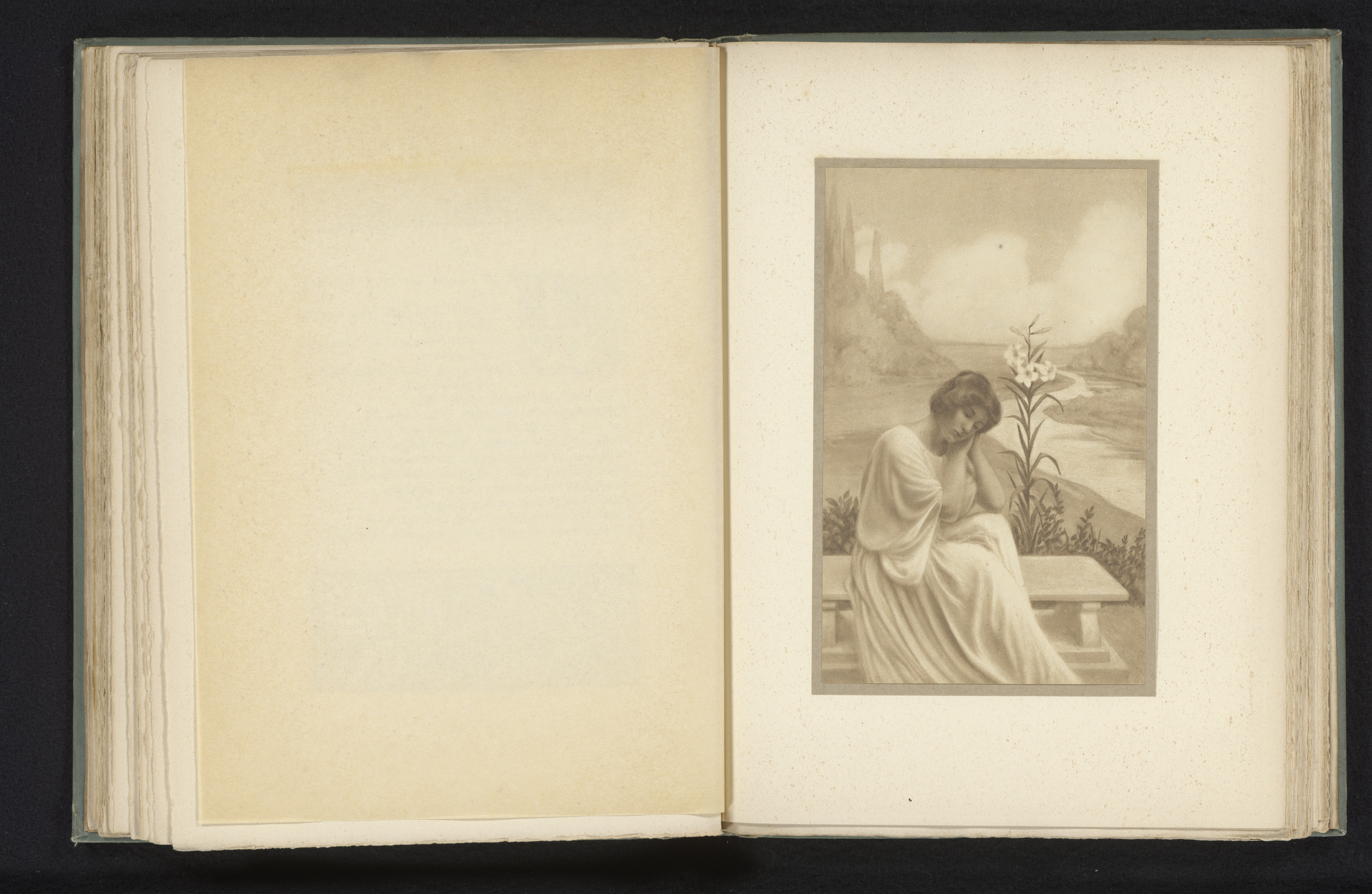 Vrouw zittend op een bank in een landschap met lelie