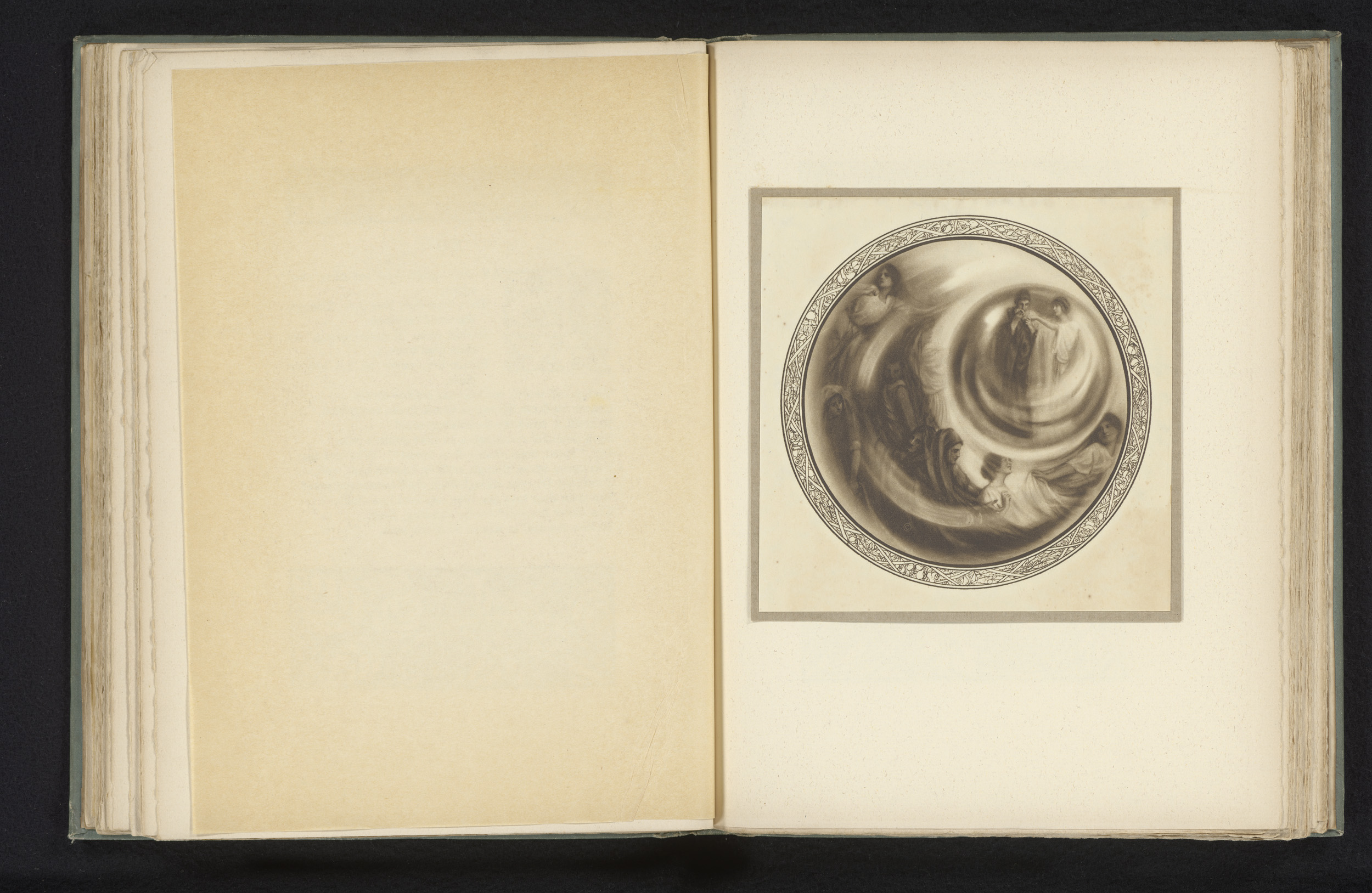 Vrouw met naakt kind in een landschap, omlijst met b...
