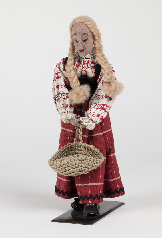 Herderin met vlechten, rode rok en mand met vijf stu...