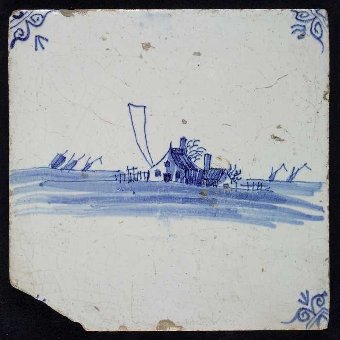 Tafereeltegel, blauw, huis en torens, hoekmotief spin
