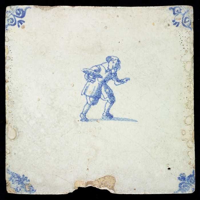 Figuurtegel, blauw, man met iets in de hand, hoekmot...