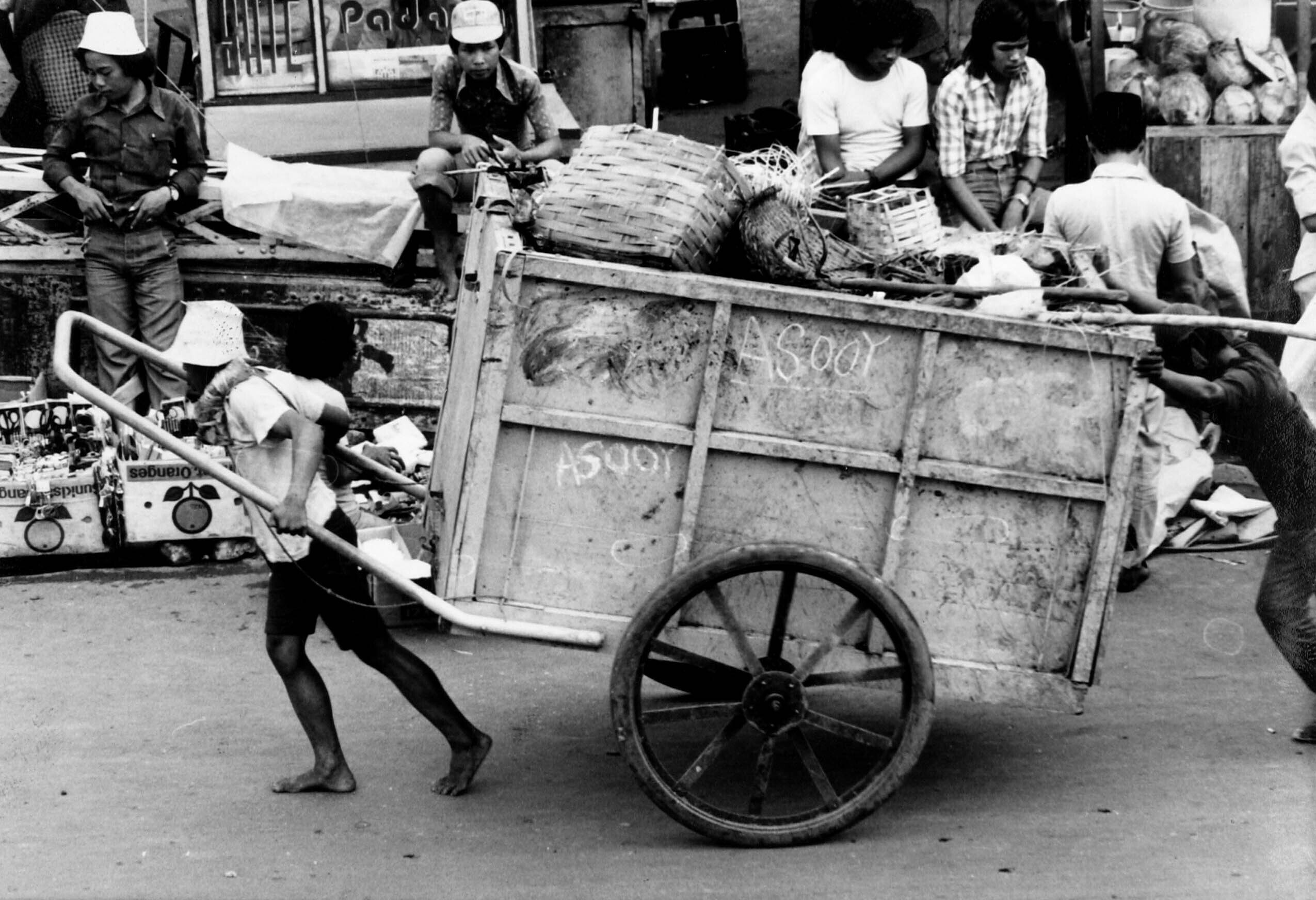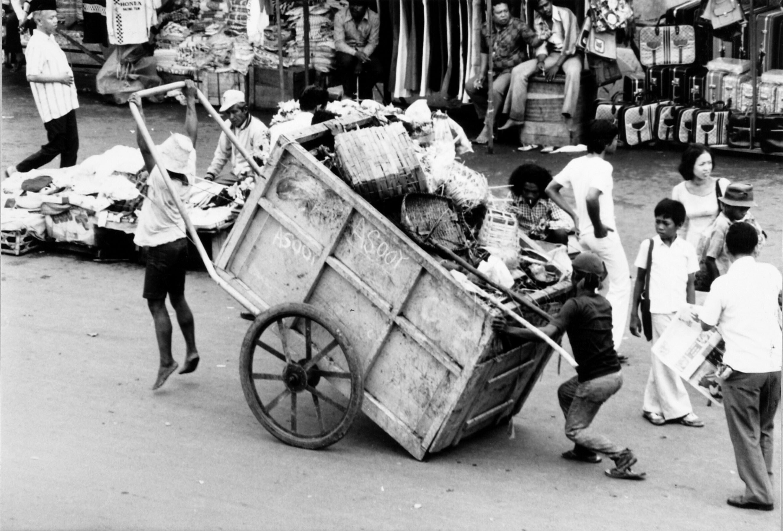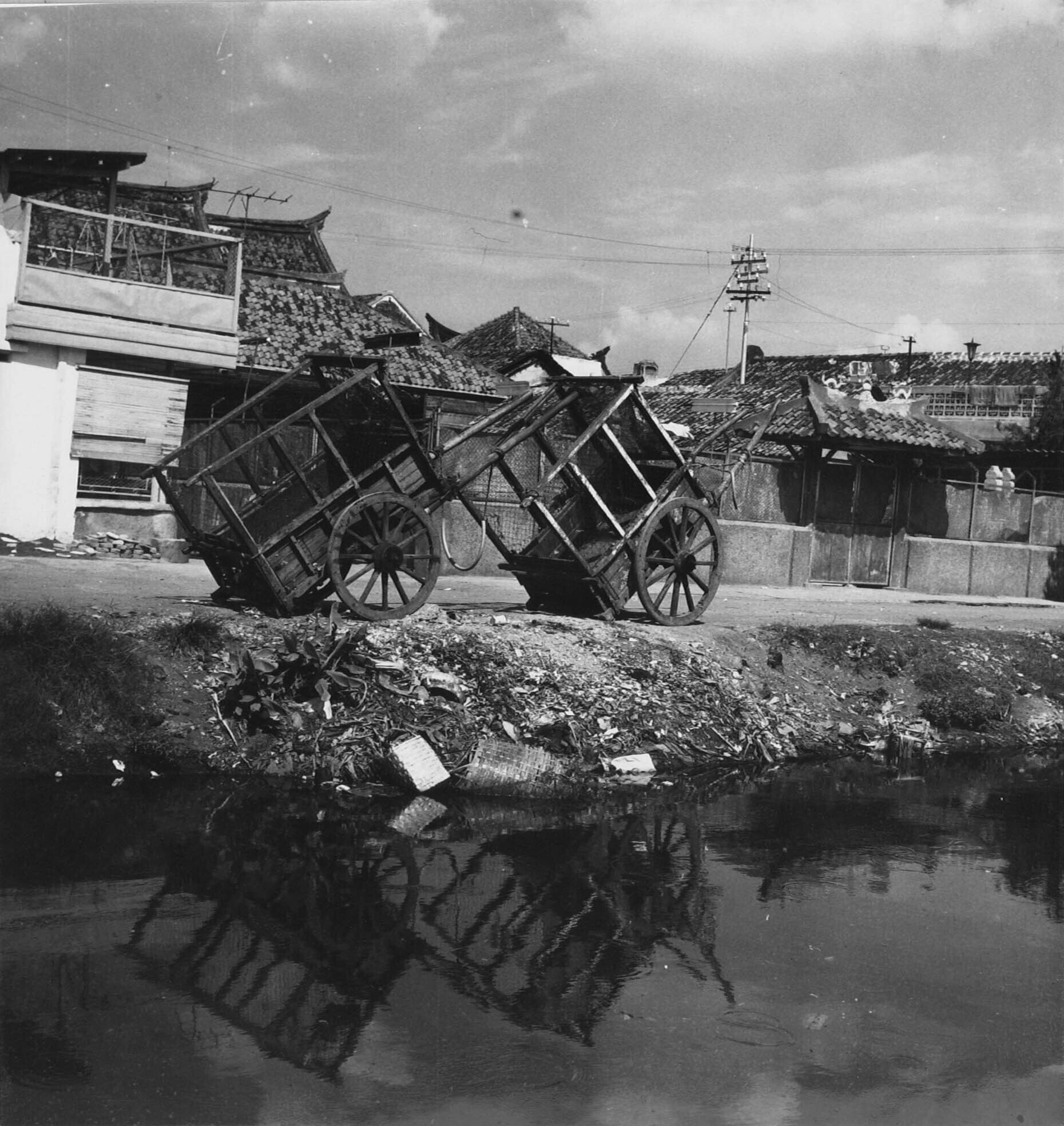 Twee vuilniskarren in de Jalan Pekojan in de Chinese...