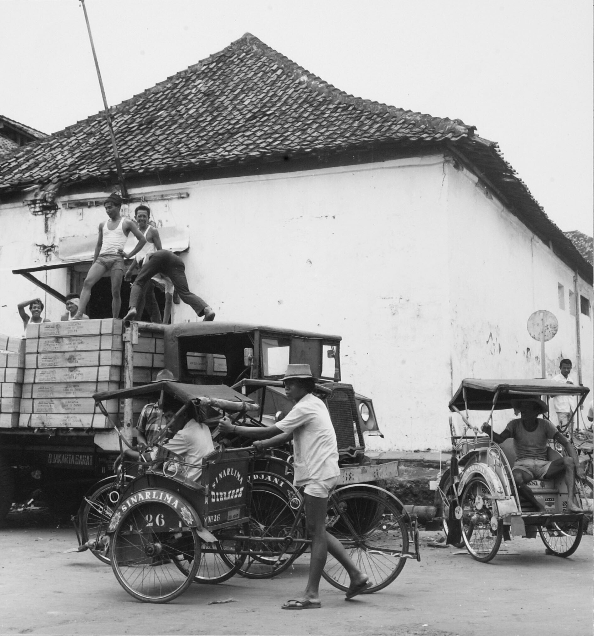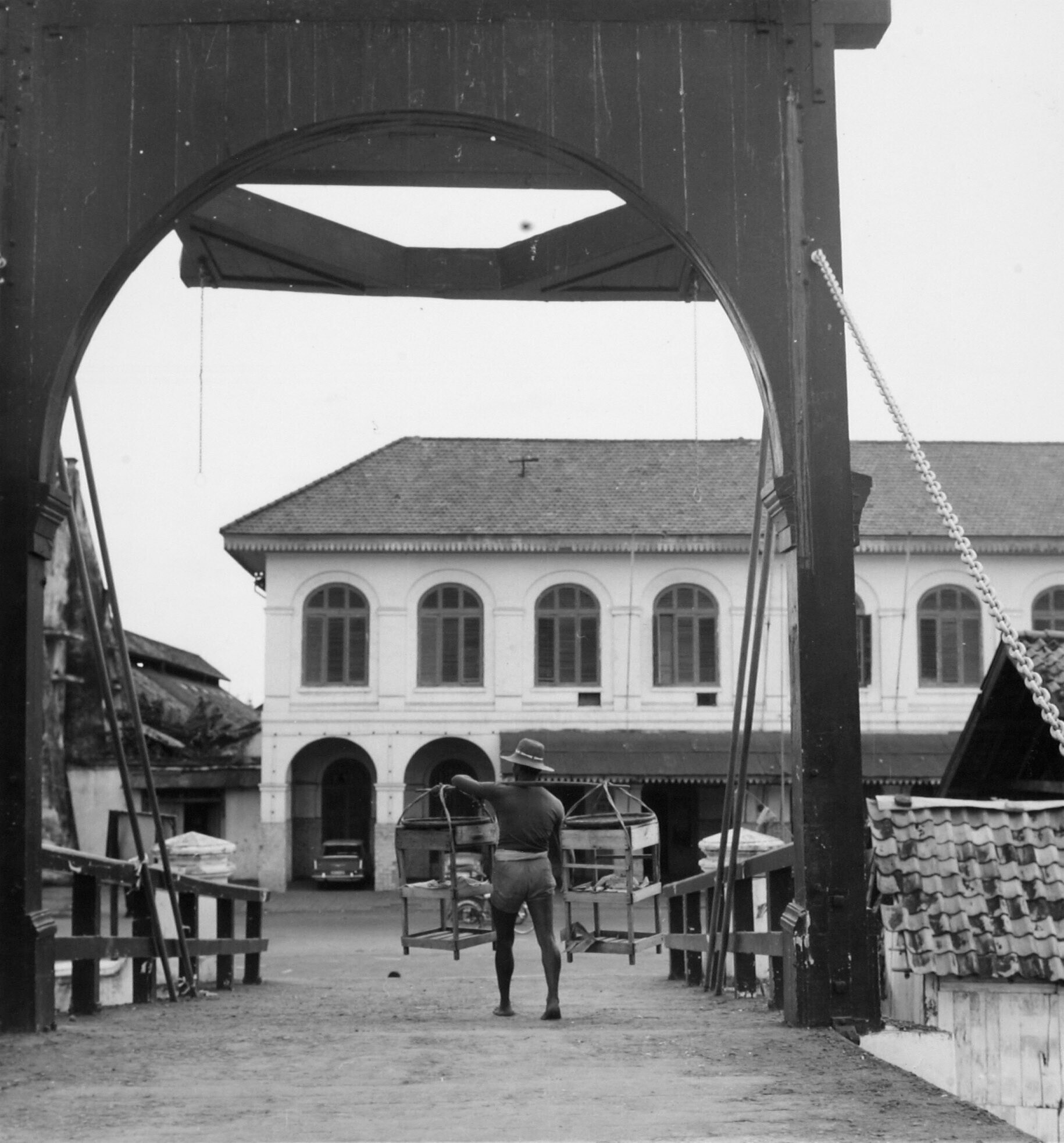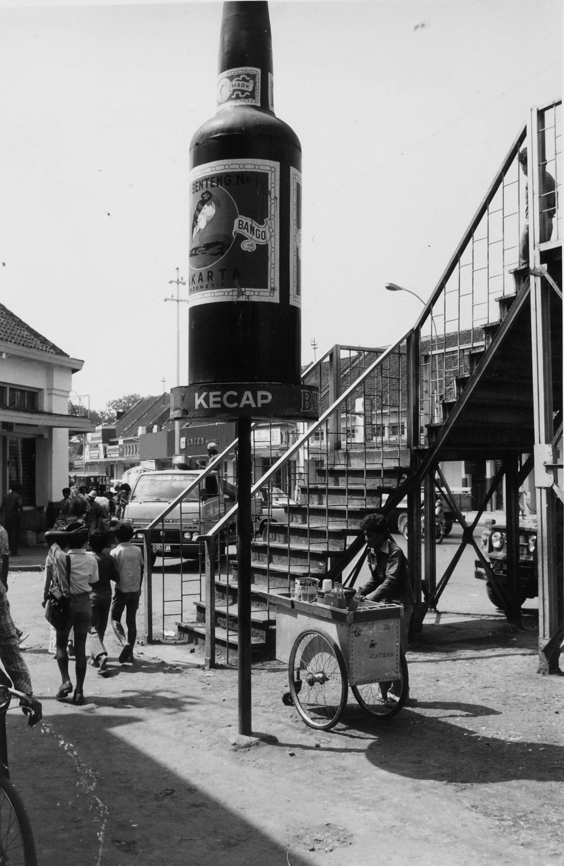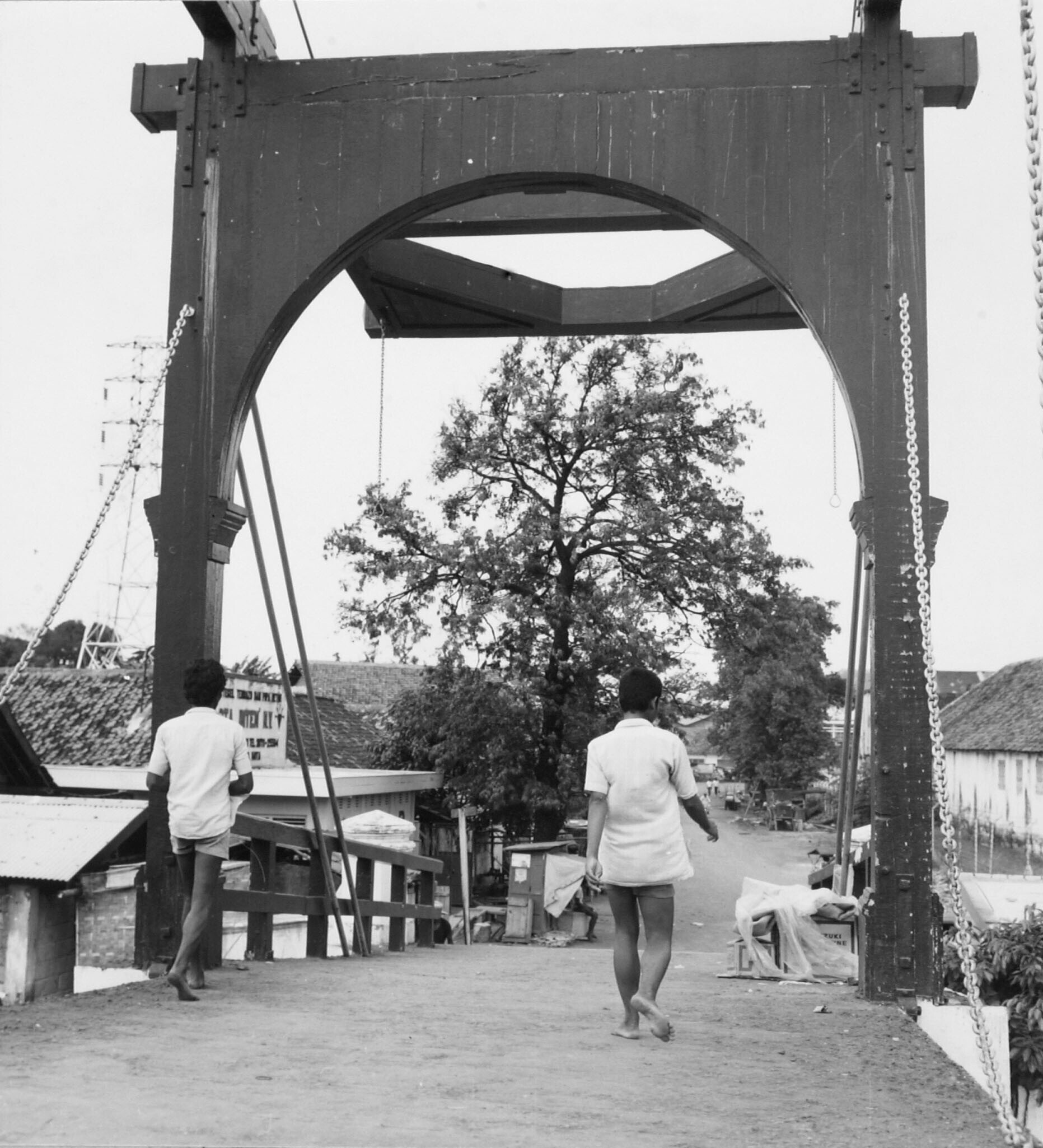 Een verkoper van tempeh op een ophaalbrug in het oud...