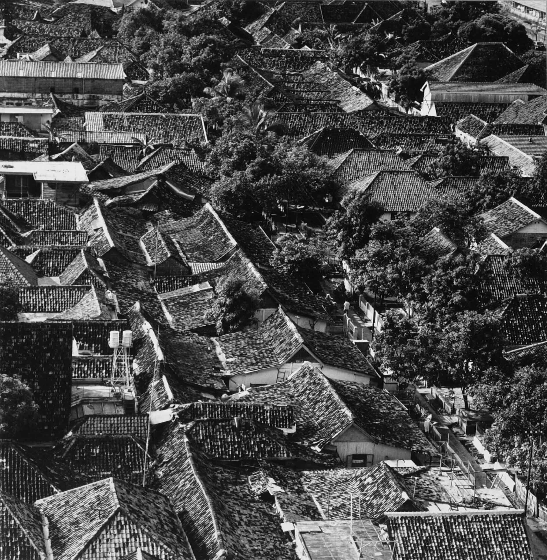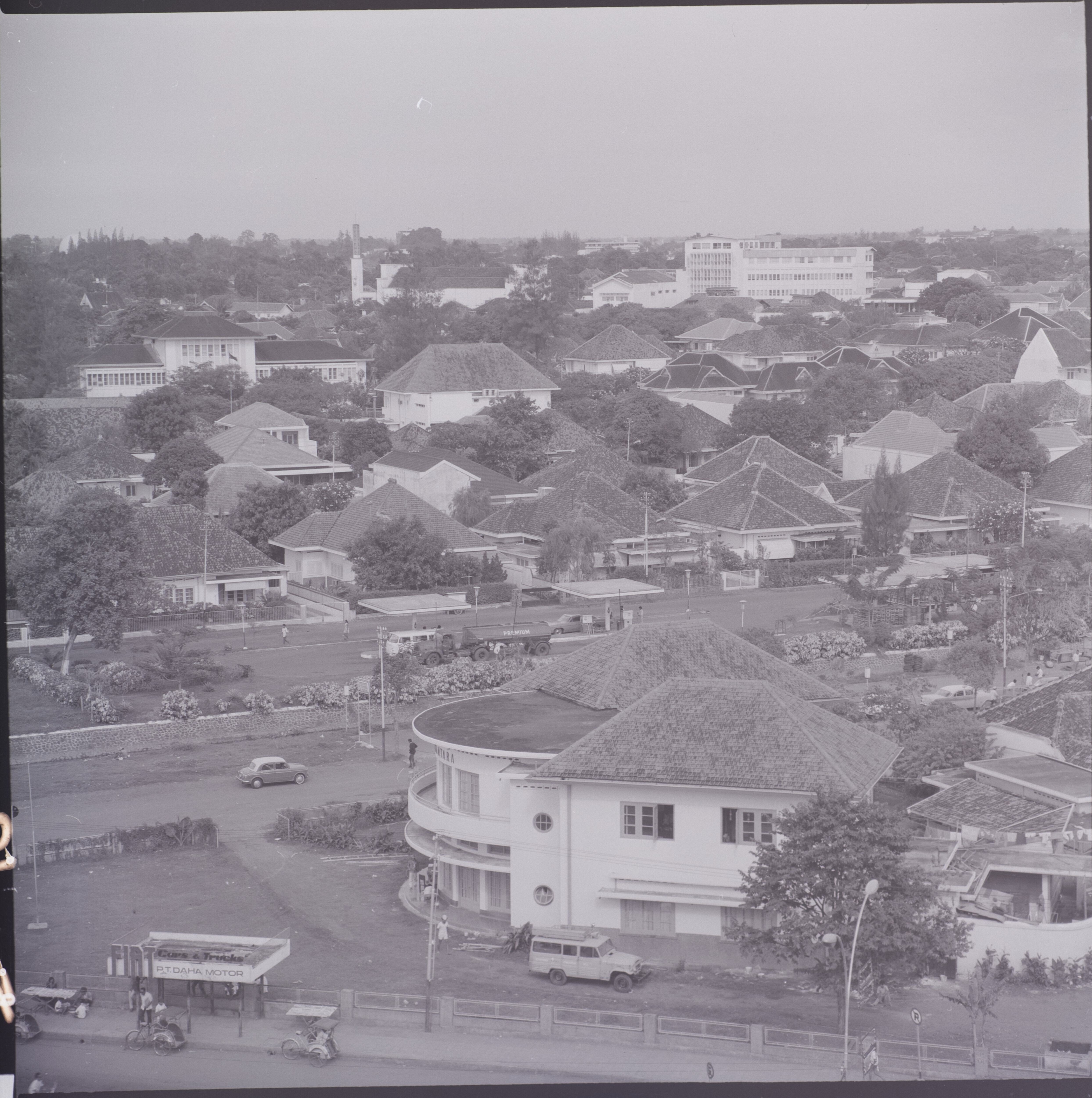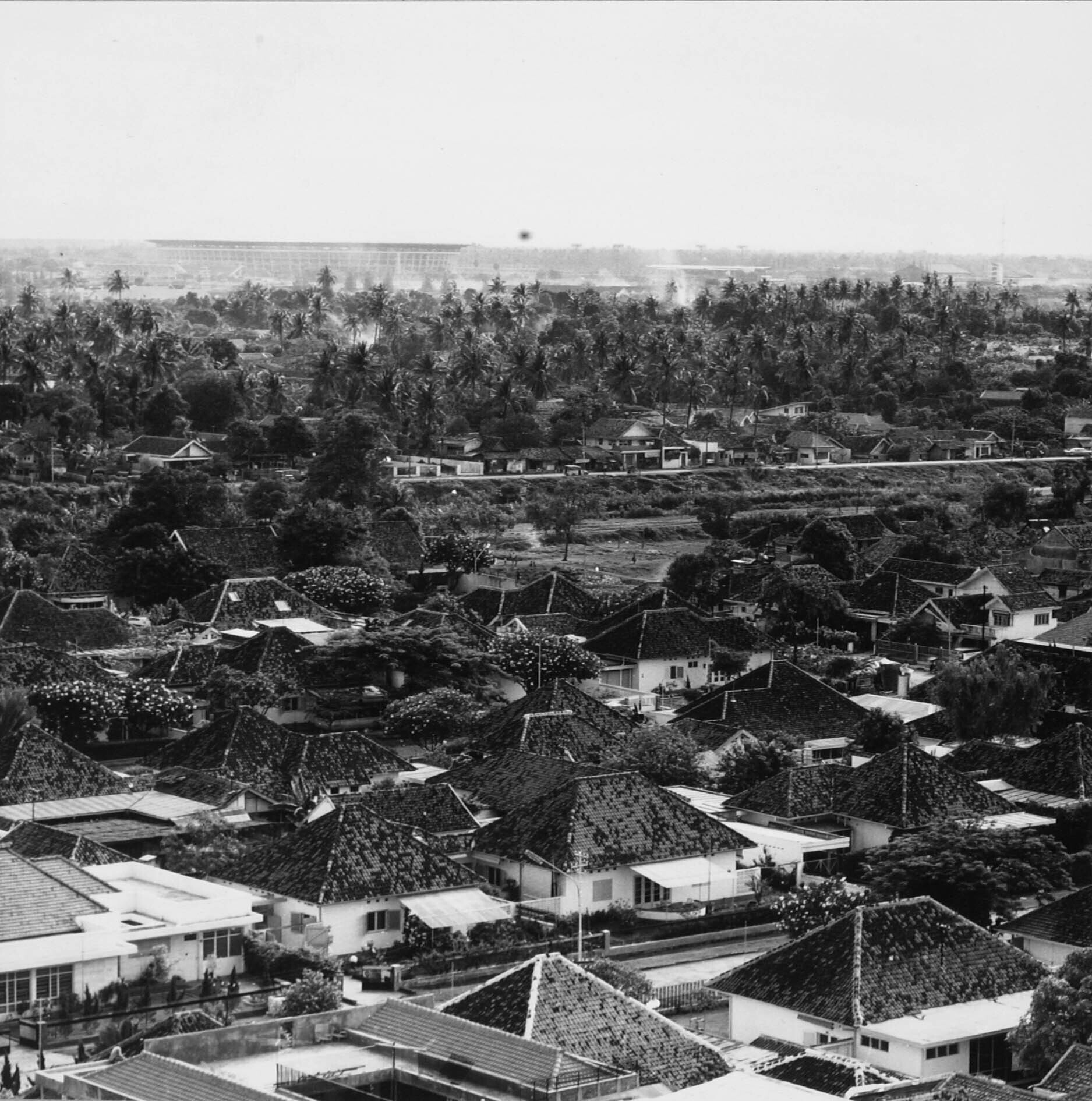 Gezicht op de wijk Menteng vanuit Hotel Kartika Plaza