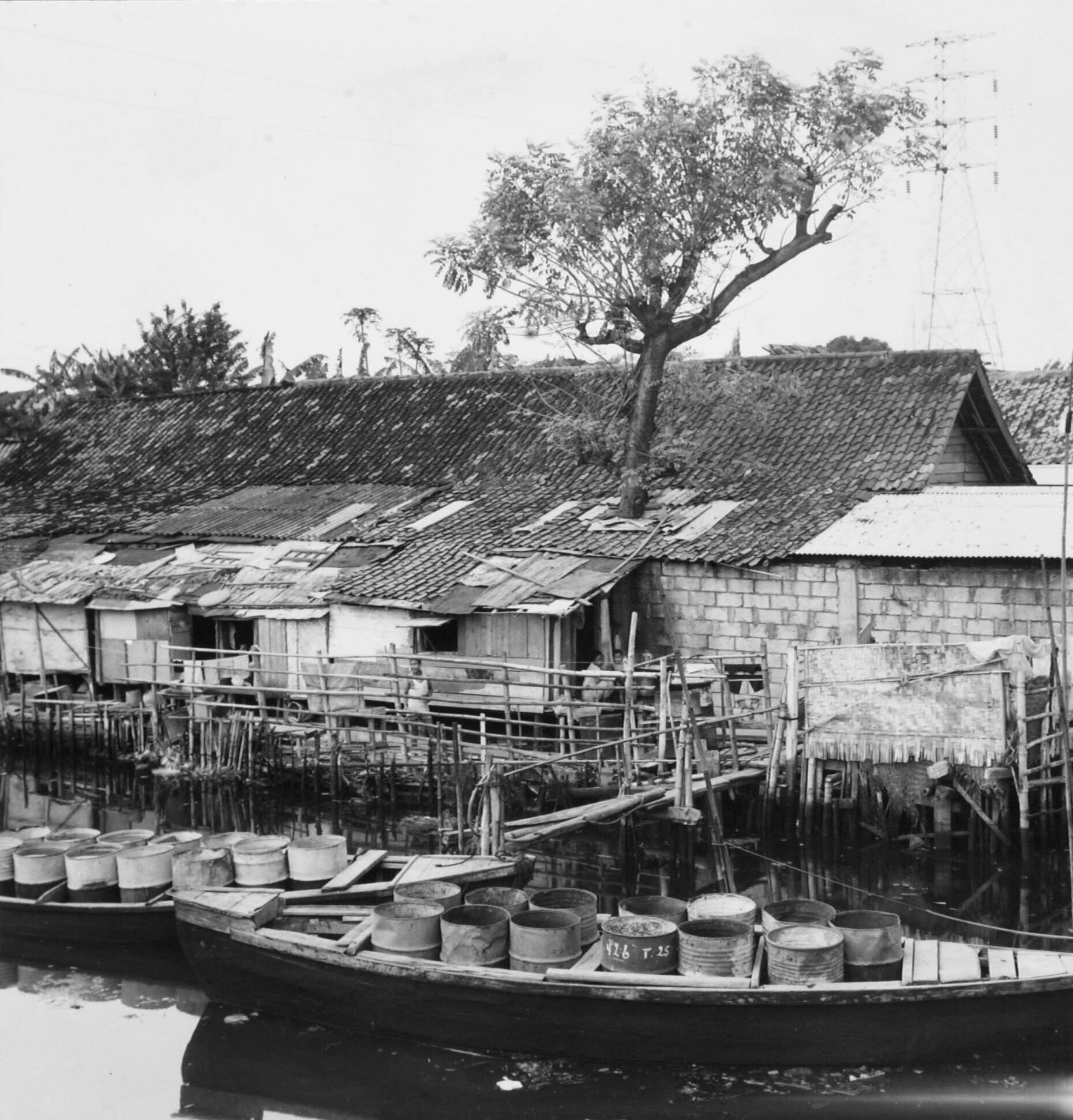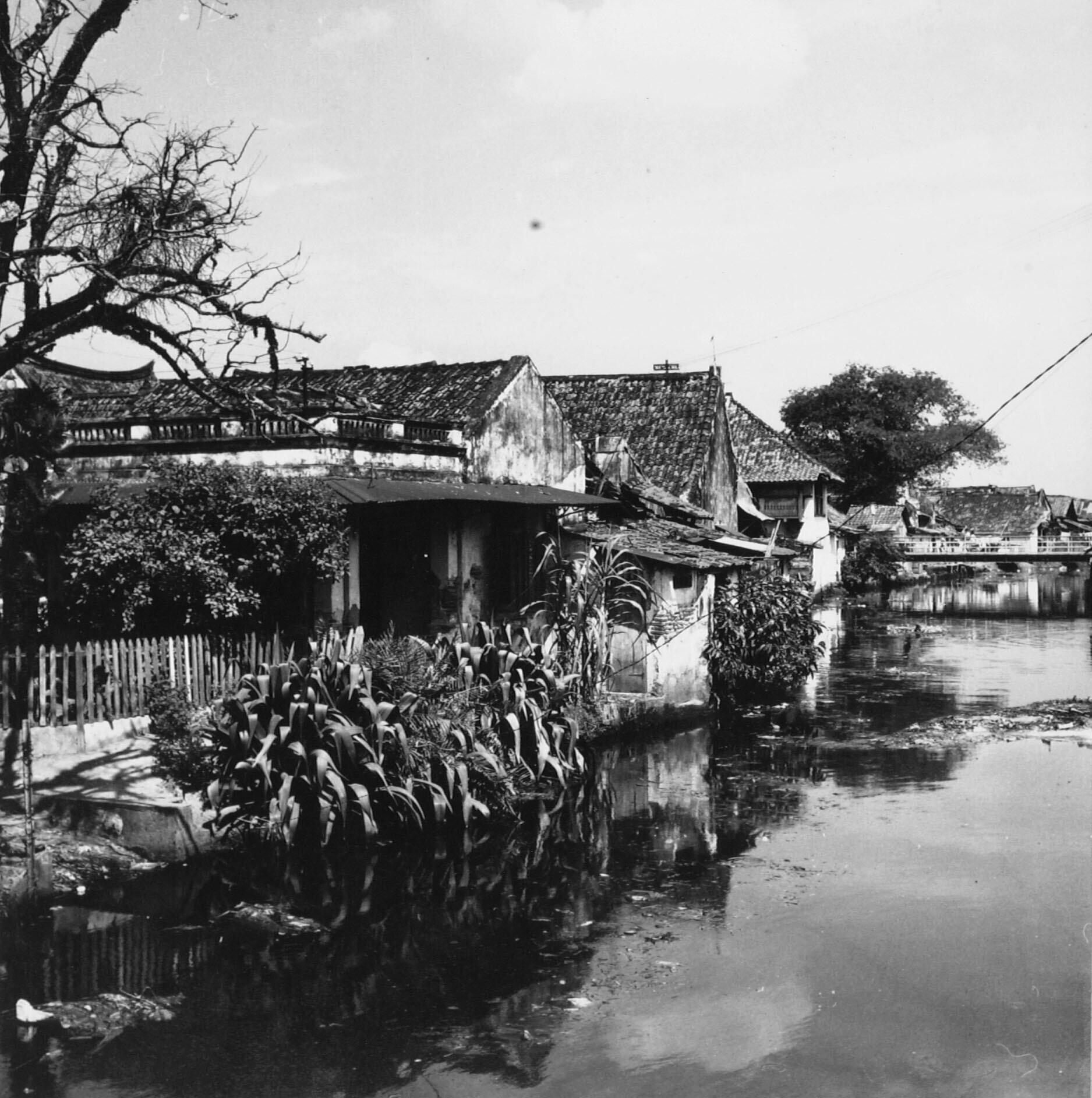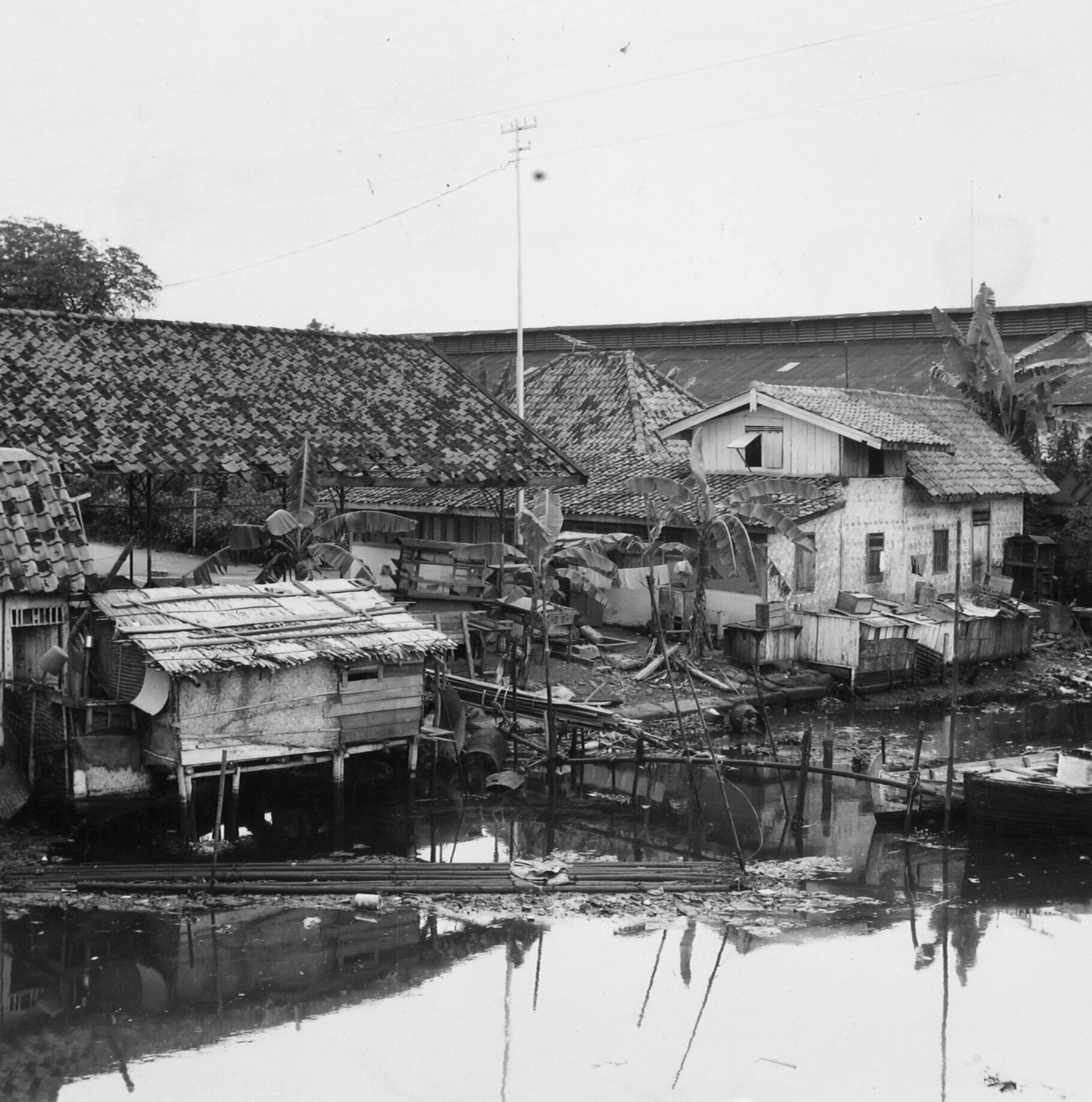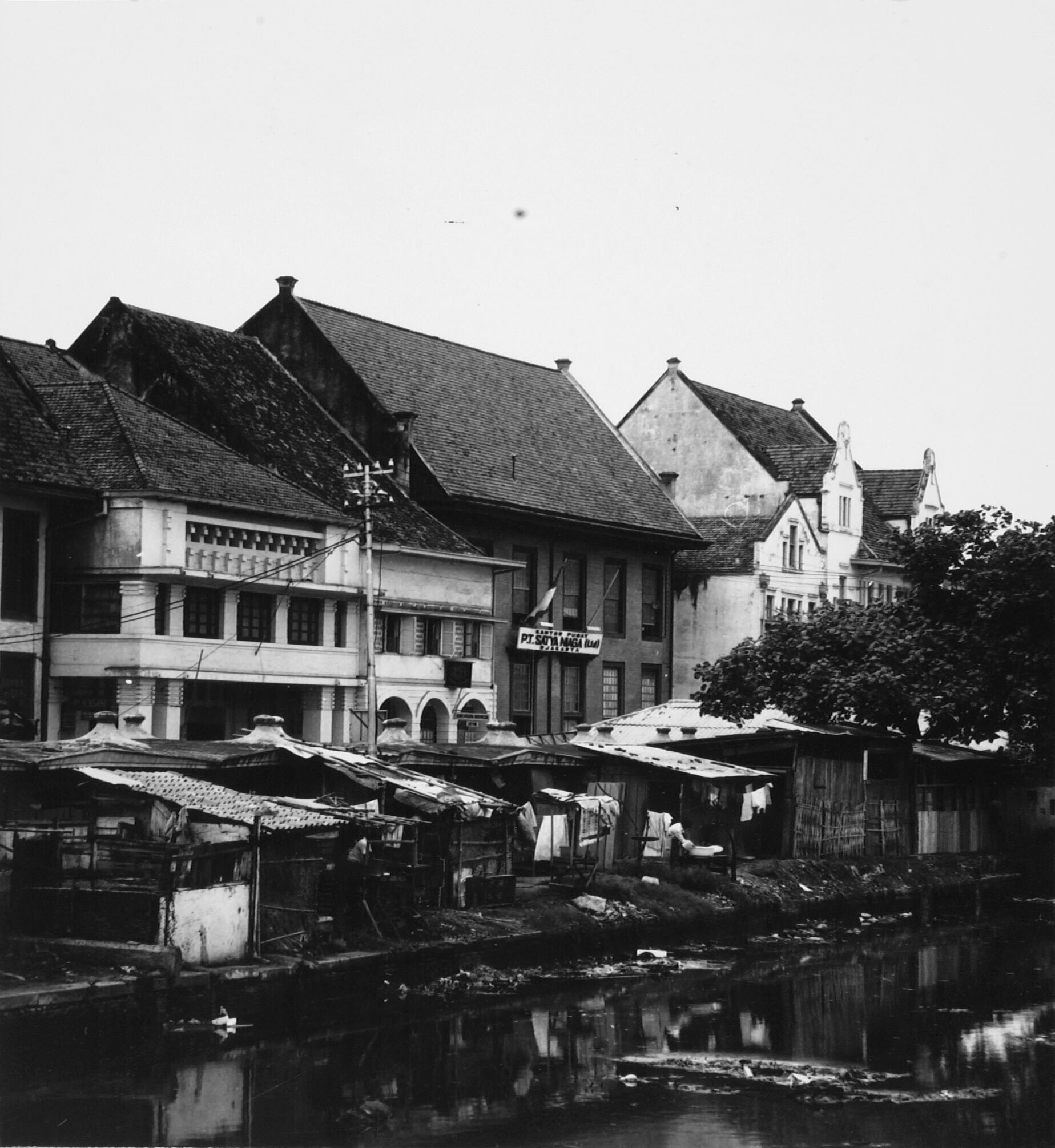Gezicht op bebouwing aan de oever van Kali Besar in ...