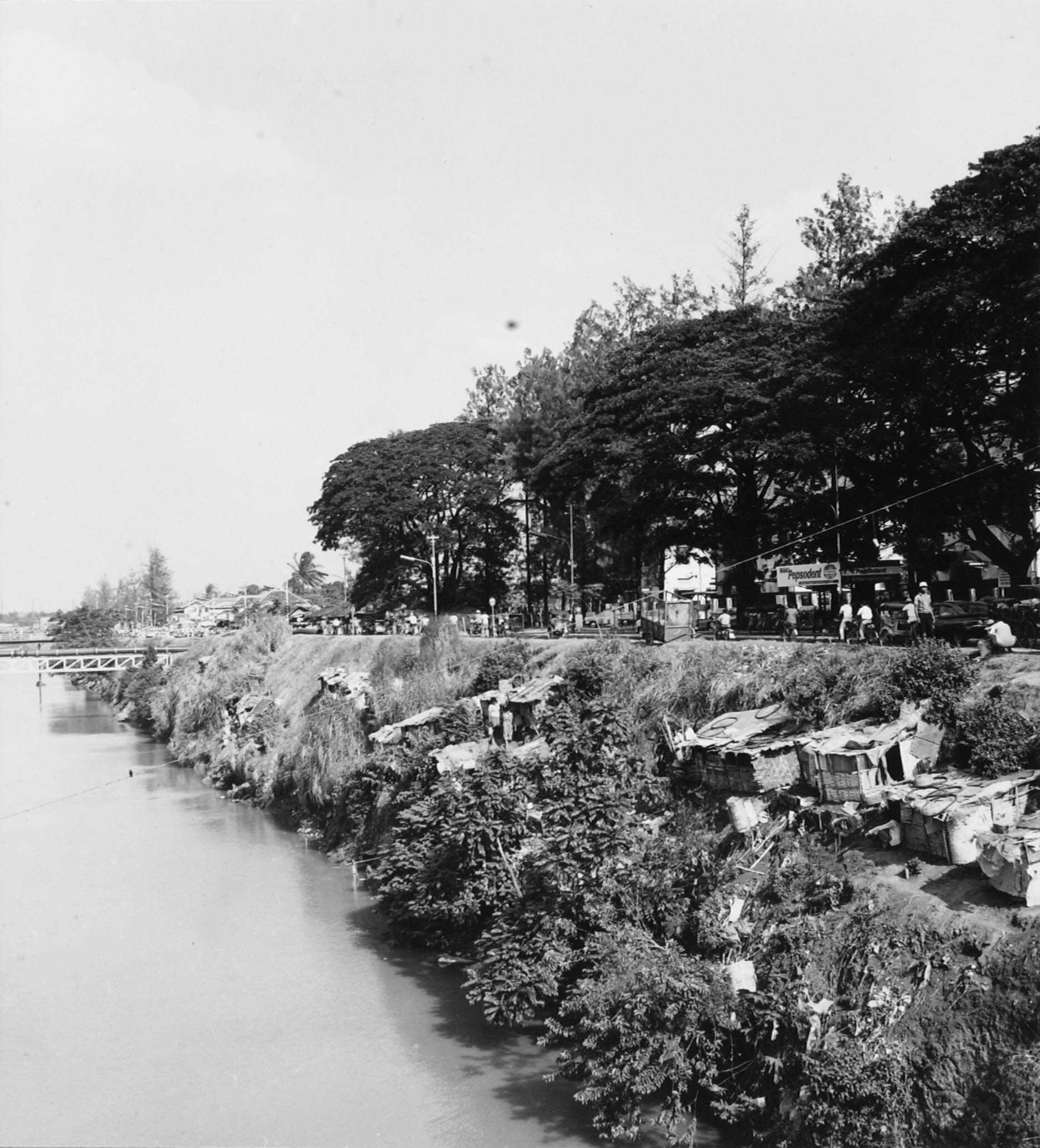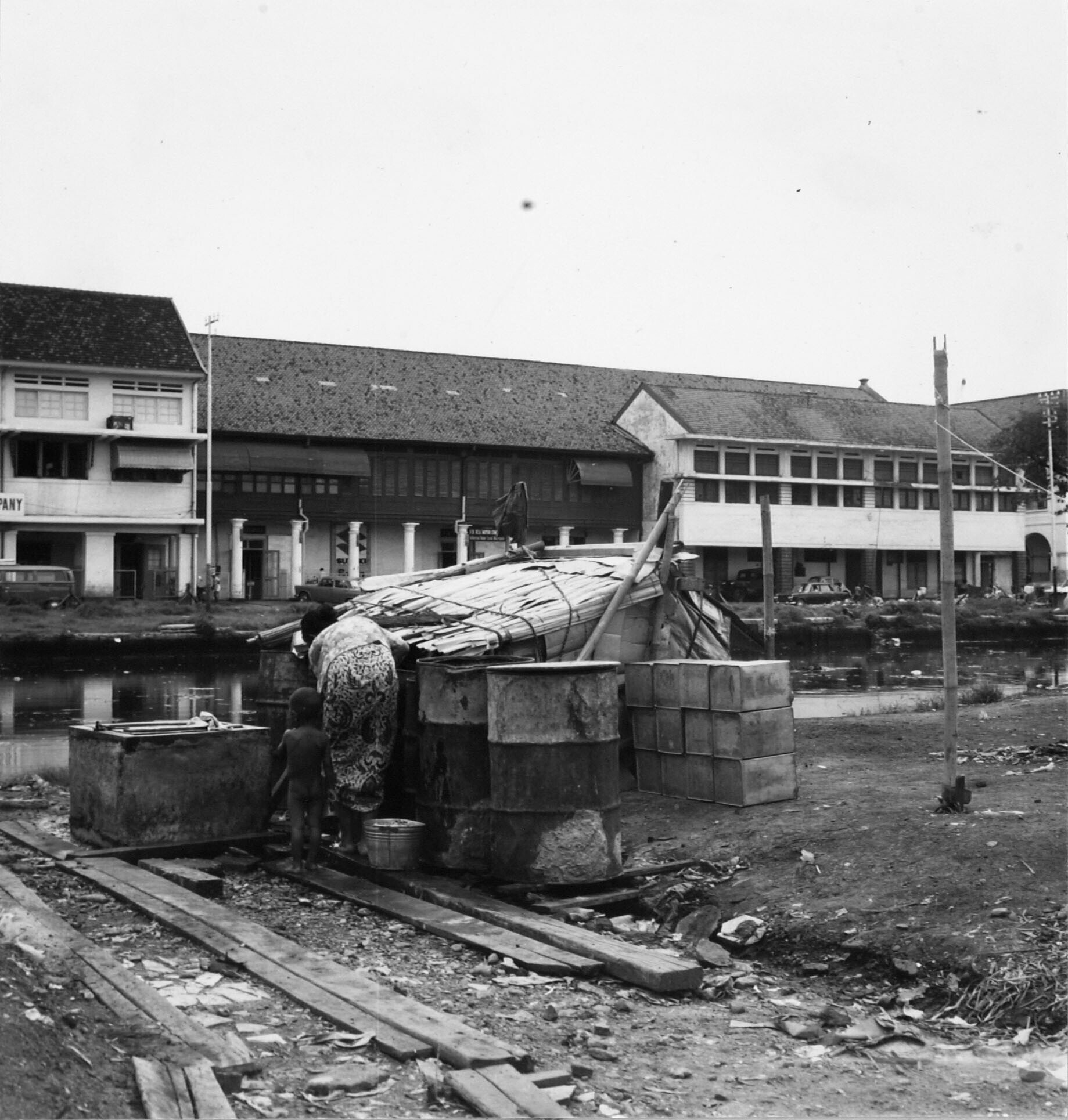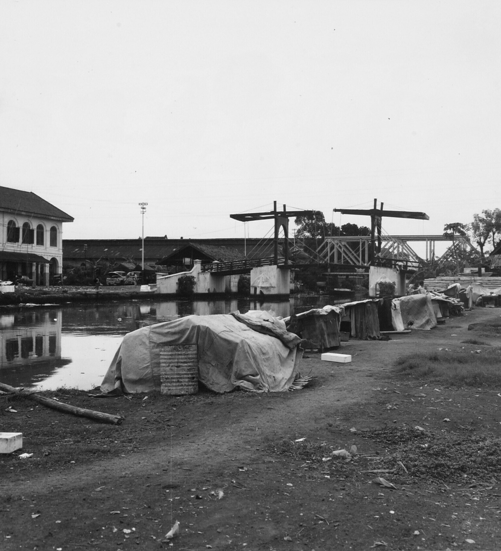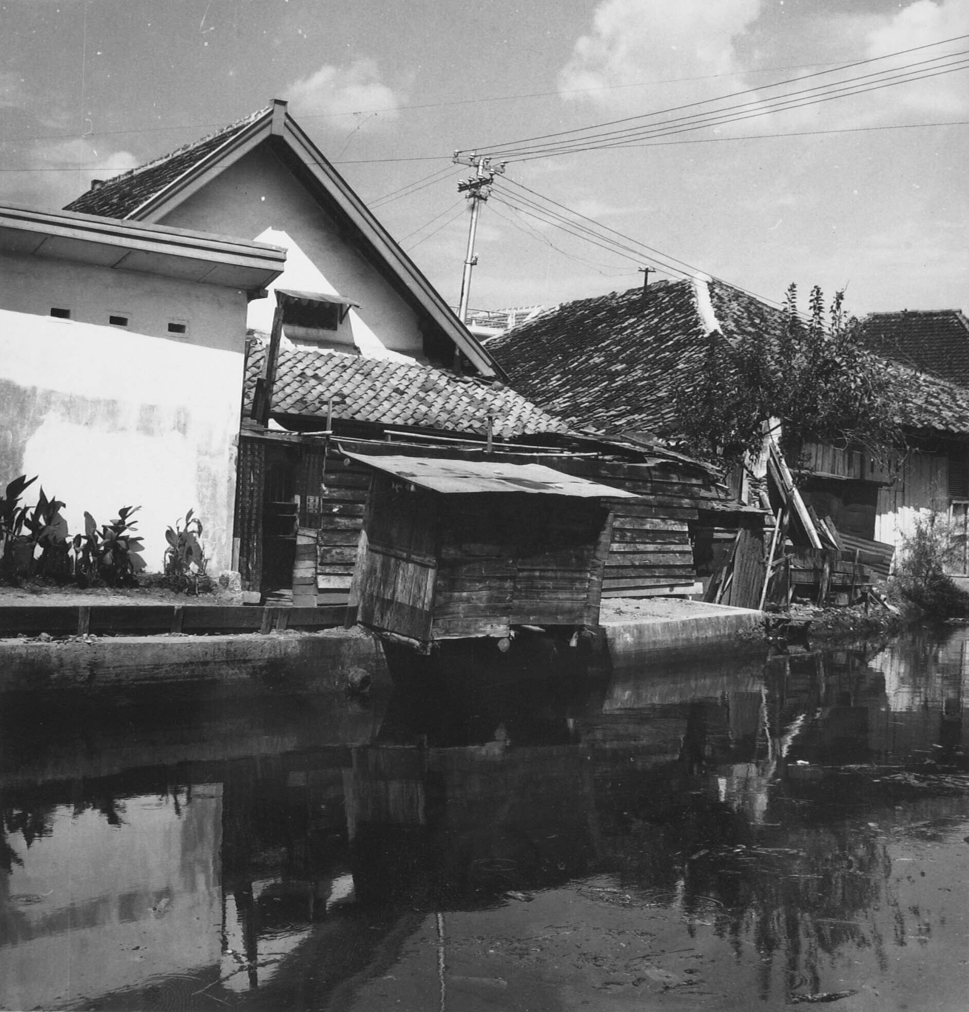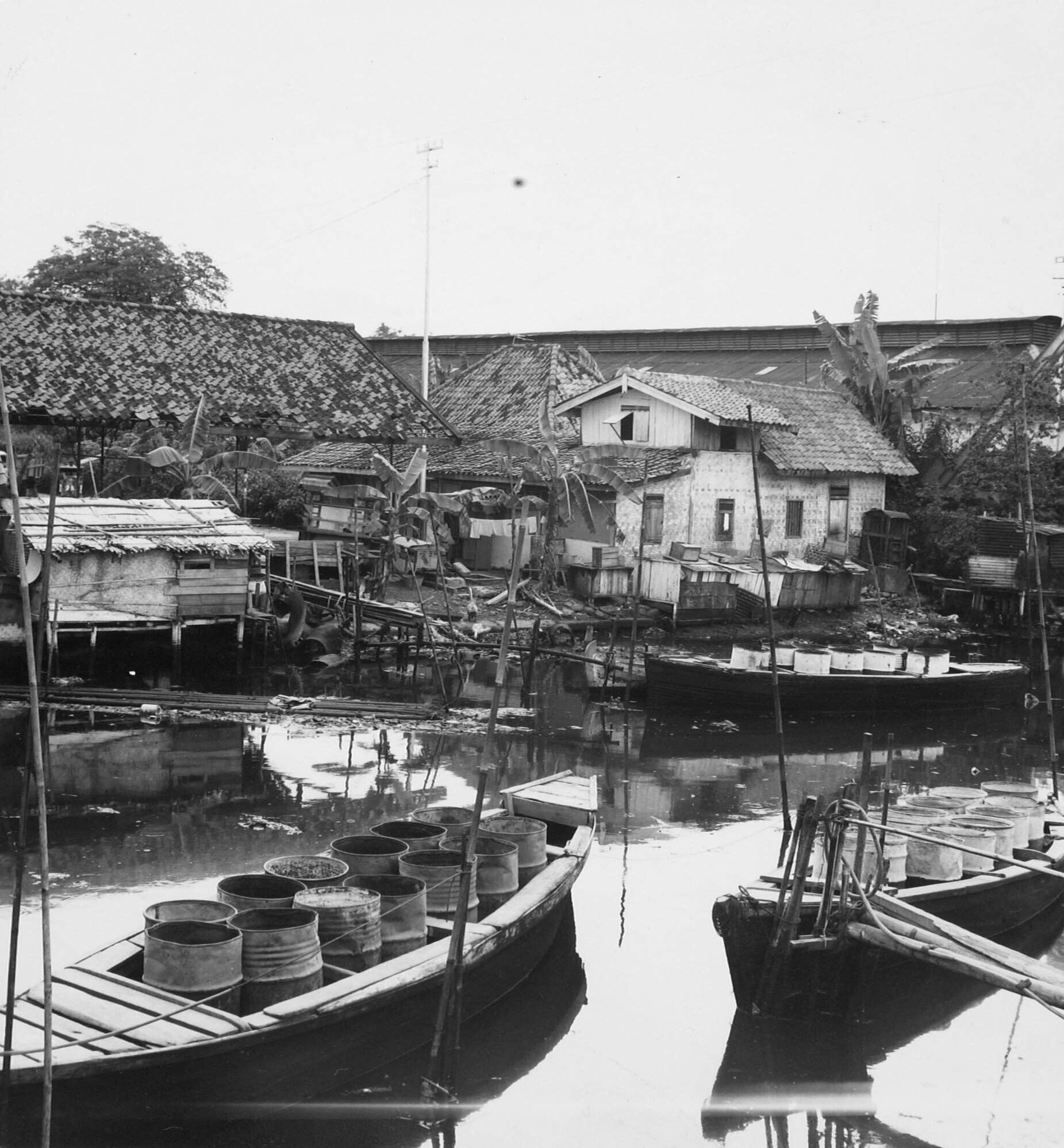 Gezicht op bebouwing aan de oever van Kali Besar in ...