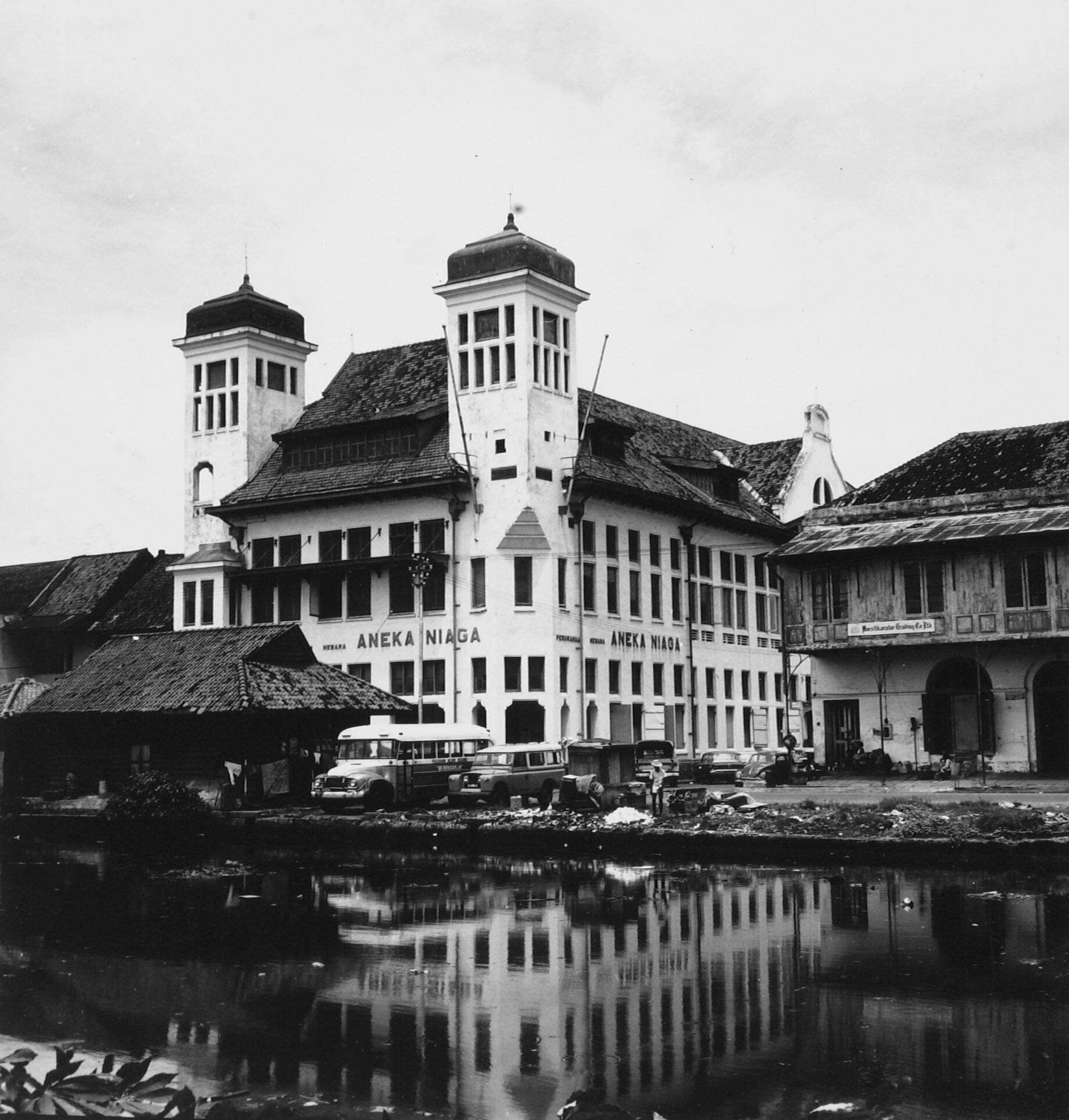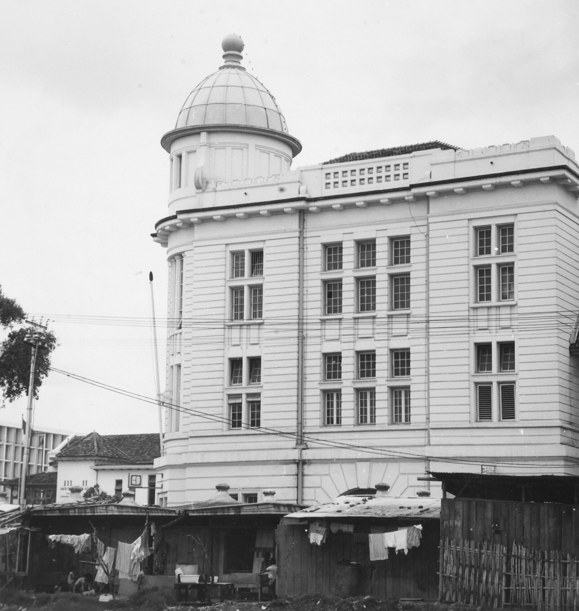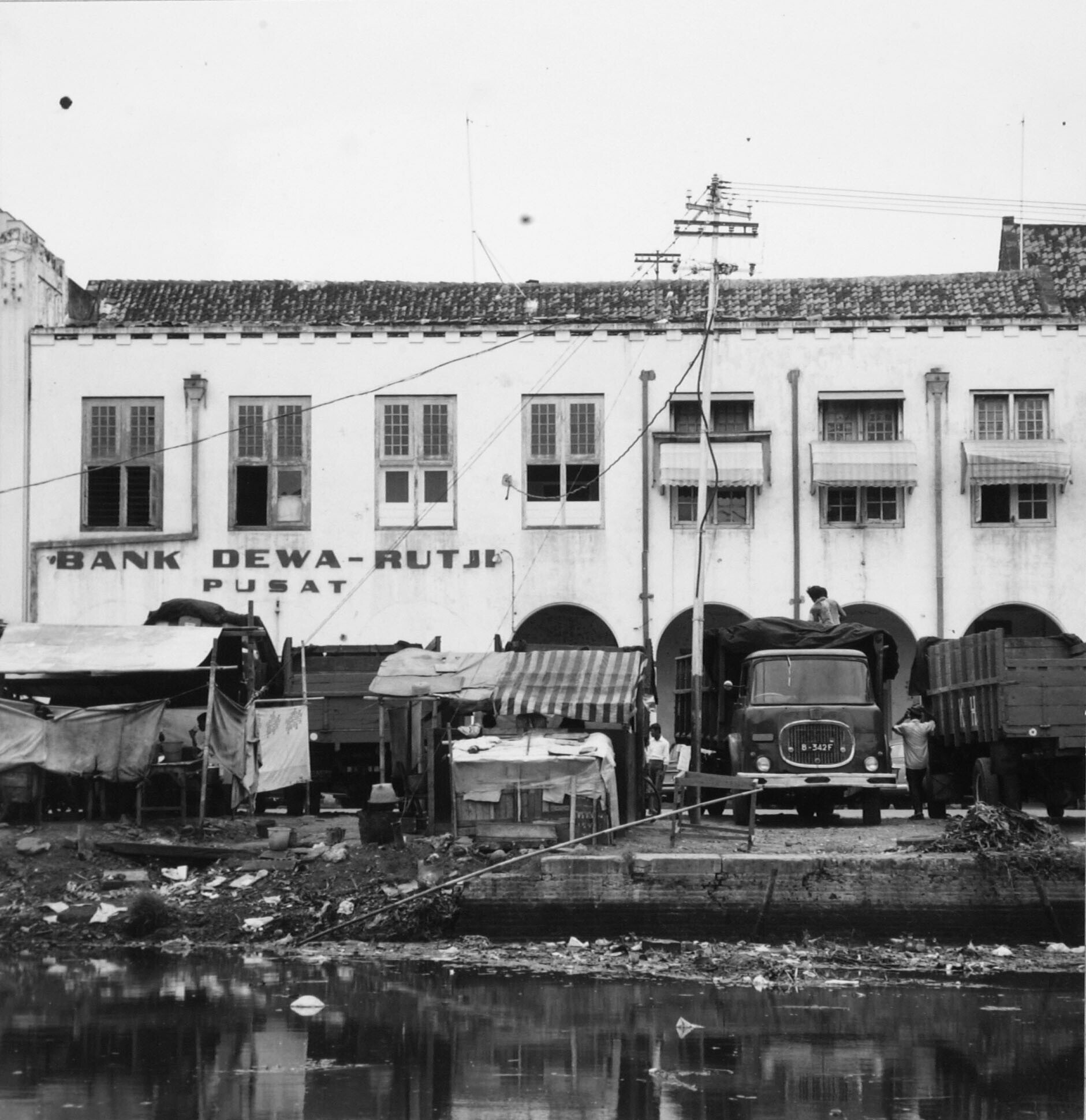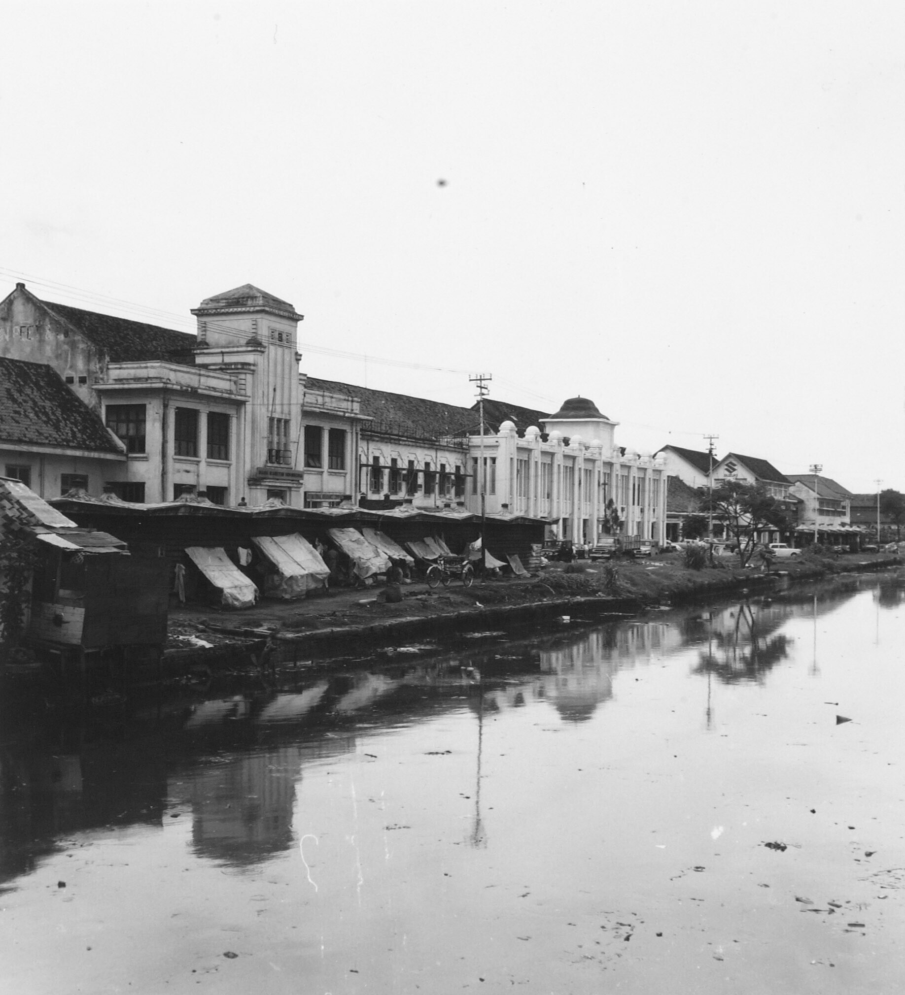Bankgebouw en andere bebouwing aan de oever van Kali...
