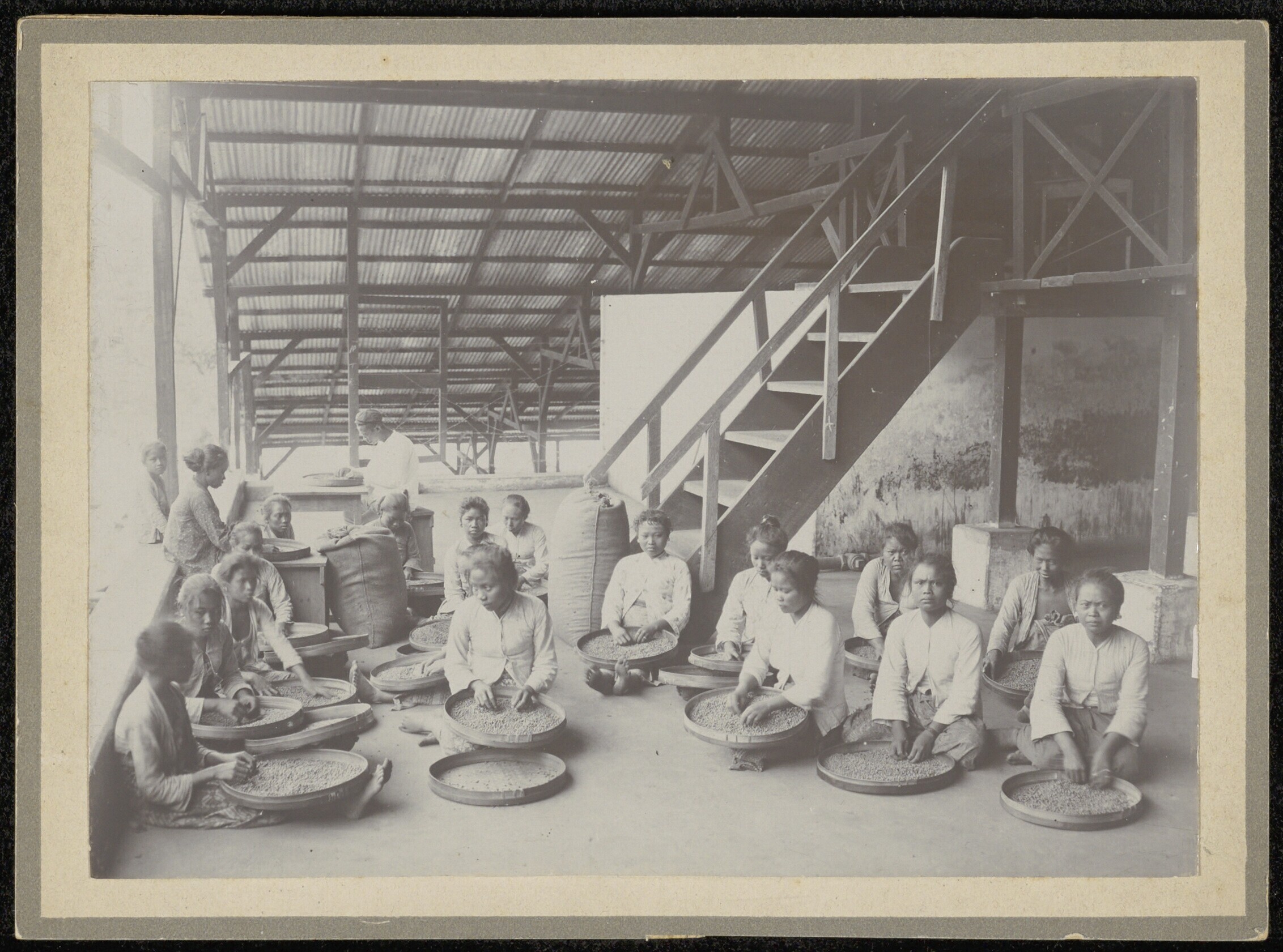 Het sorteren (?) van koffiebonen in een droogbak op ...