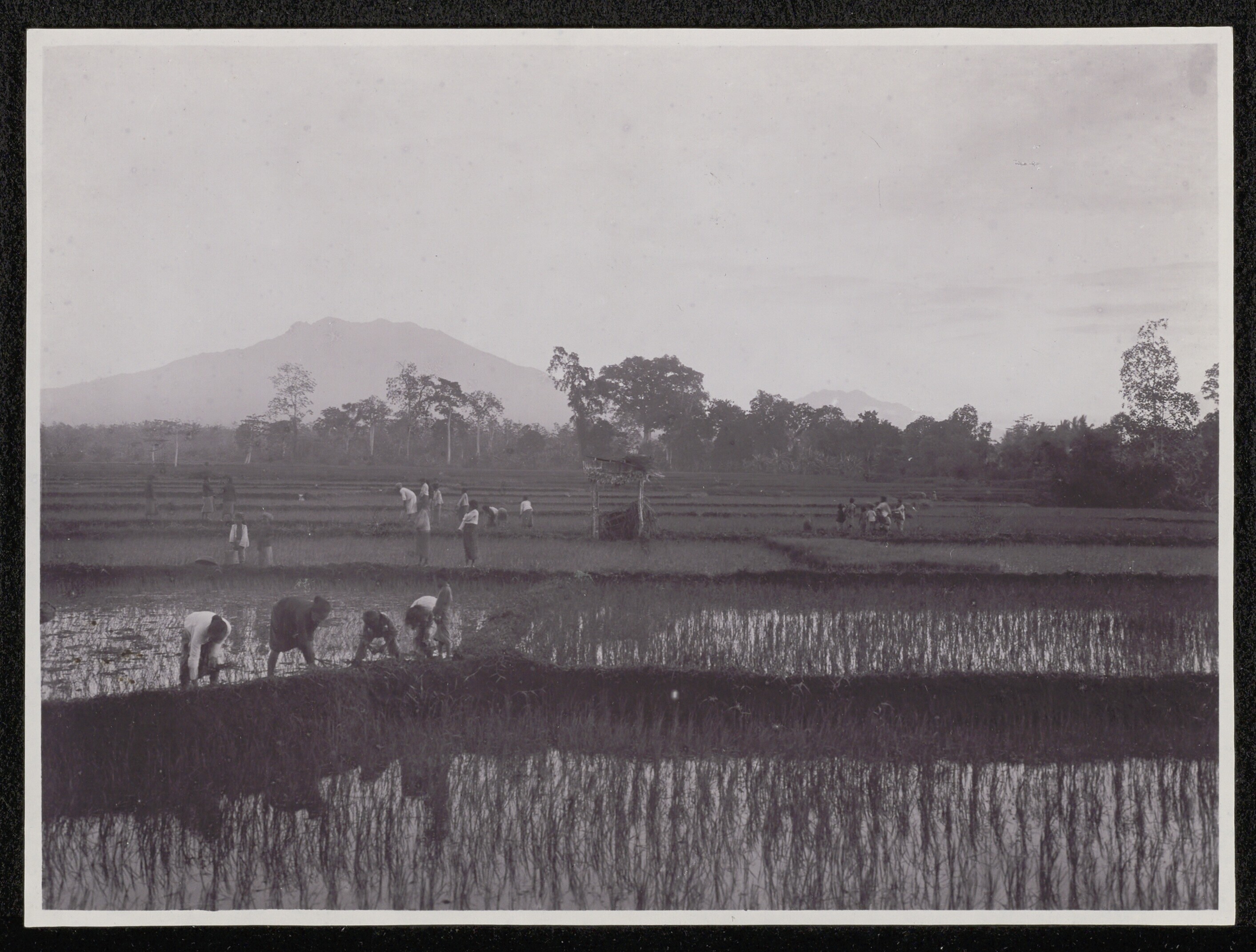 Vrouwen planten rijst in een sawa bij Madioen, met d...