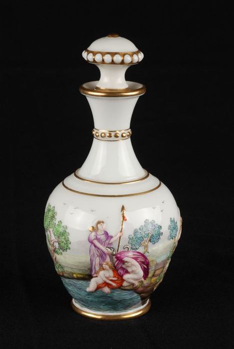 Witte fles met stolp, goudkleurige randen en in reli...