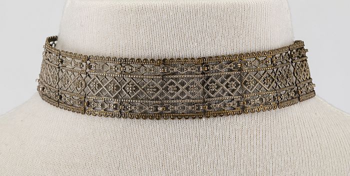 Zilverkleurige metalen keelband met filigrein