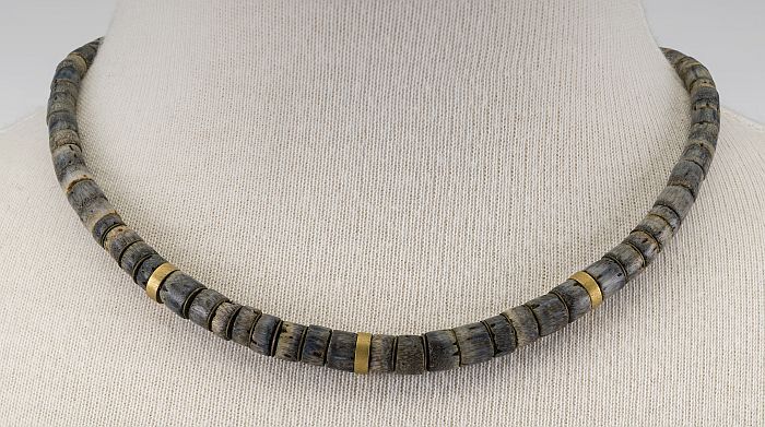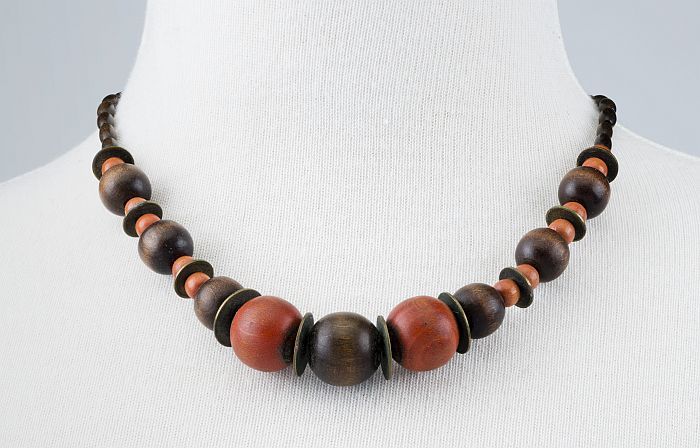 Halssnoer van bruine en oranje houten kralen en plat...
