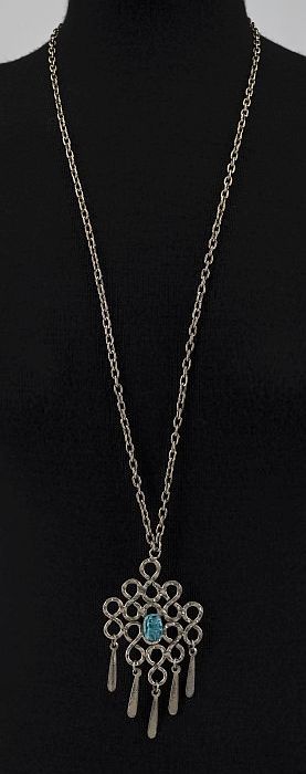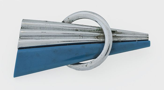 Broche van zilverkleurig metaal en blauwe kunststof