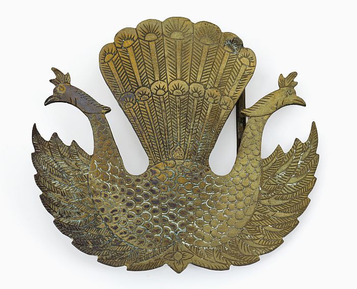Koperen ceintuurgesp in de vorm van twee pauwen