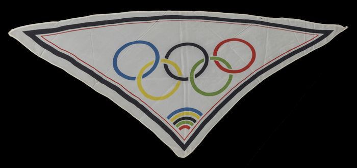 Driepuntige witte sjaal met zwarte en rode rand en h...