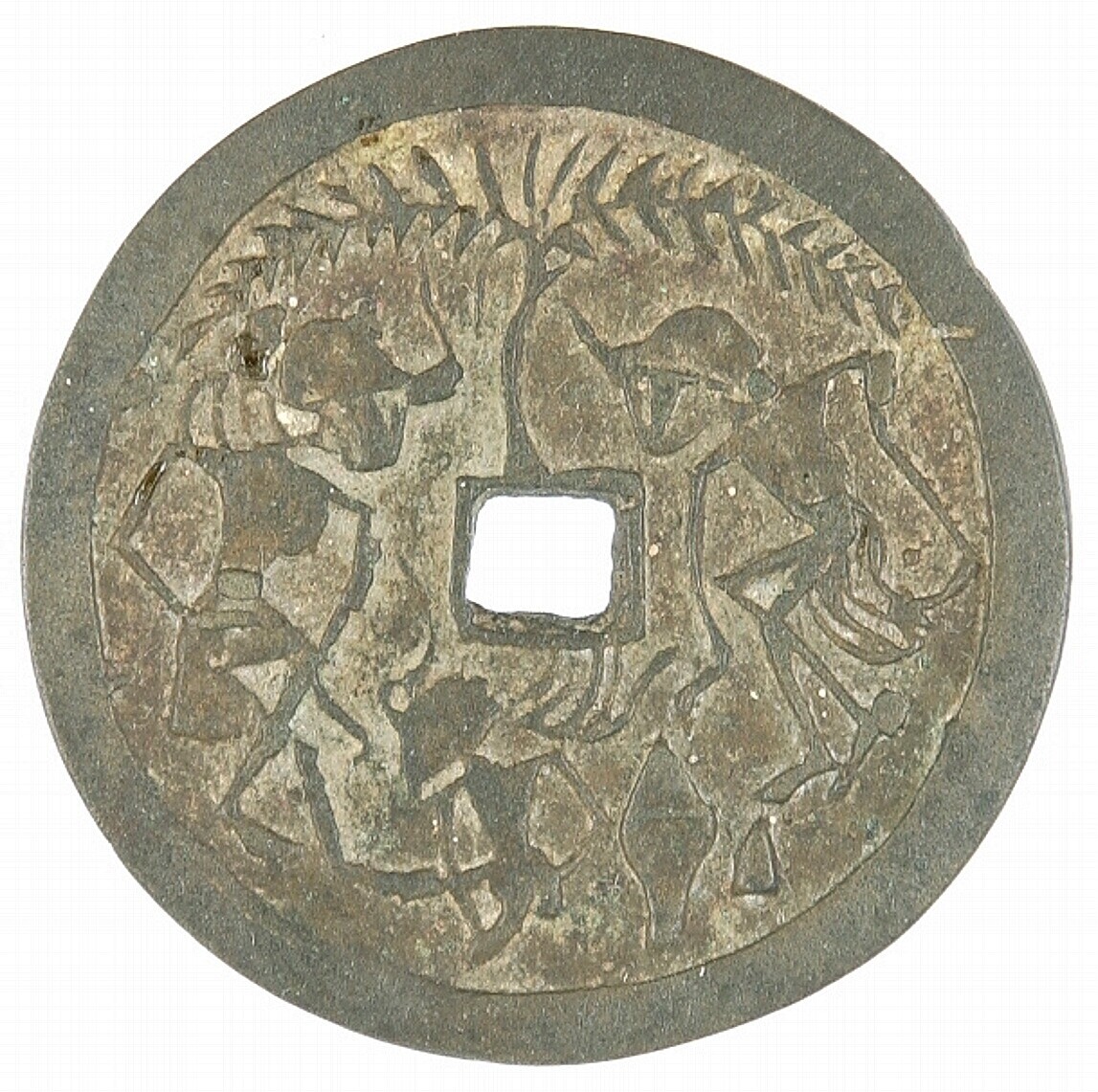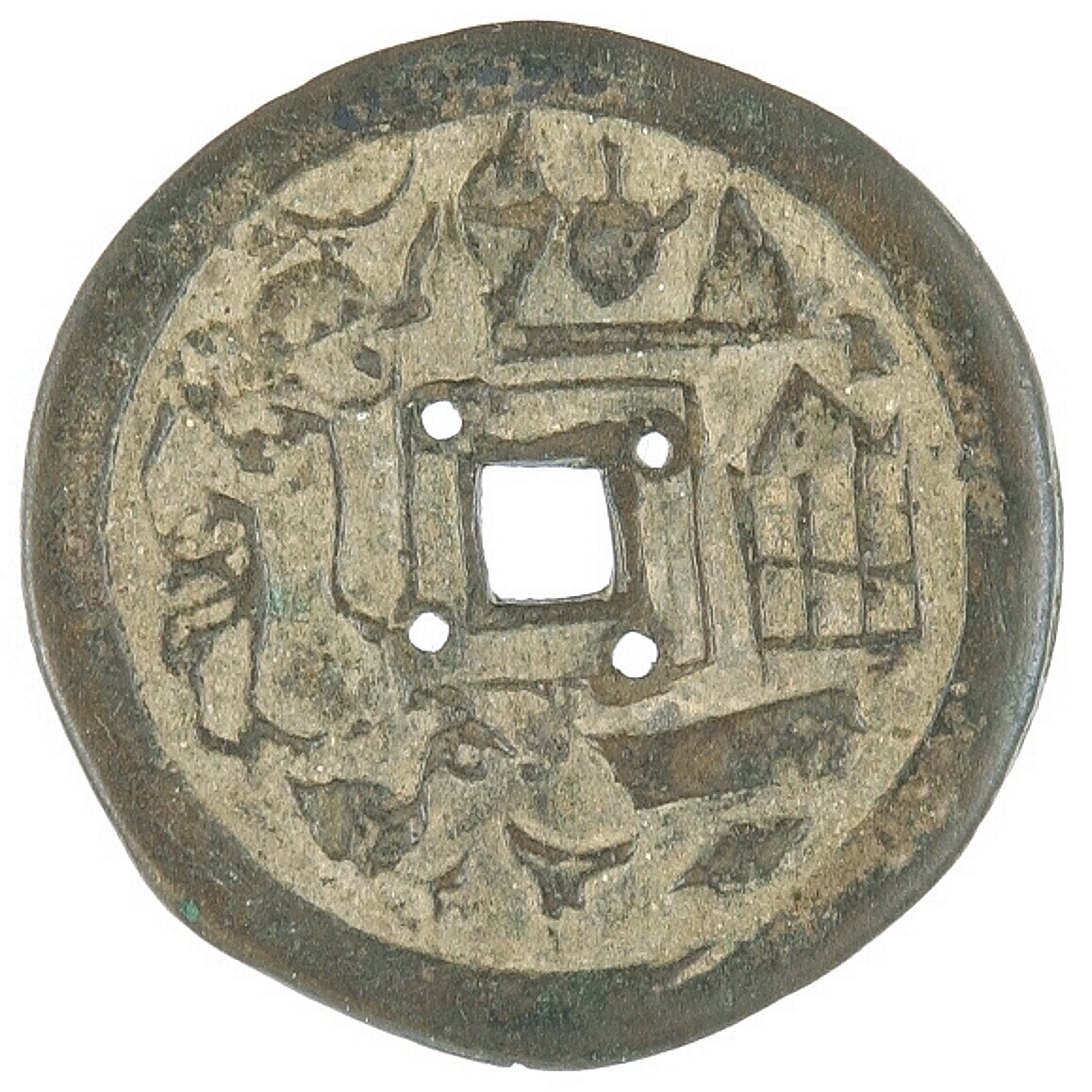 Amulet in de vorm van metalen plaatje met gat in het...
