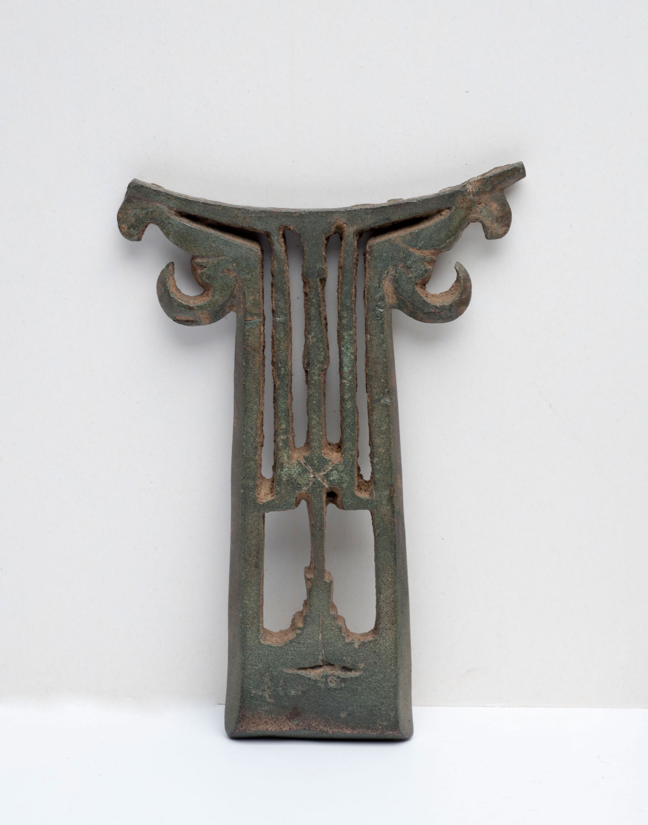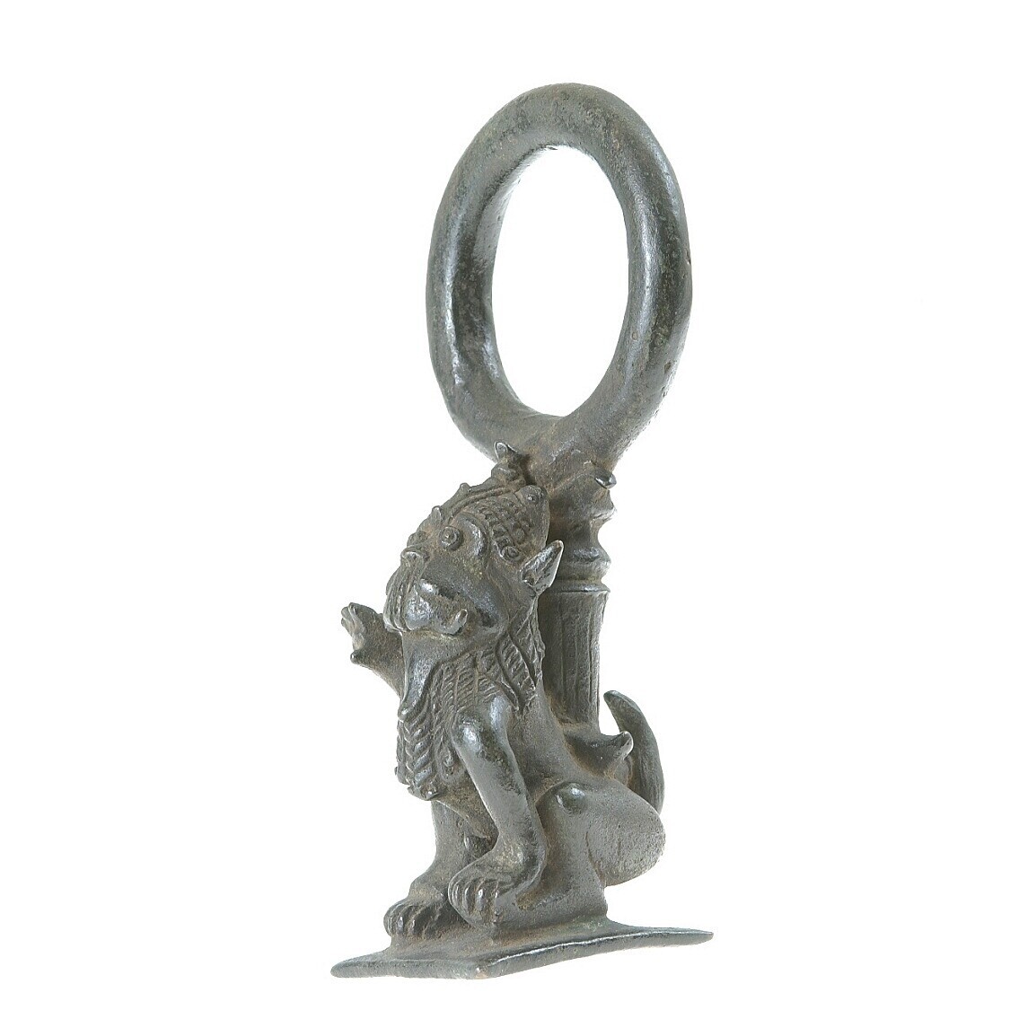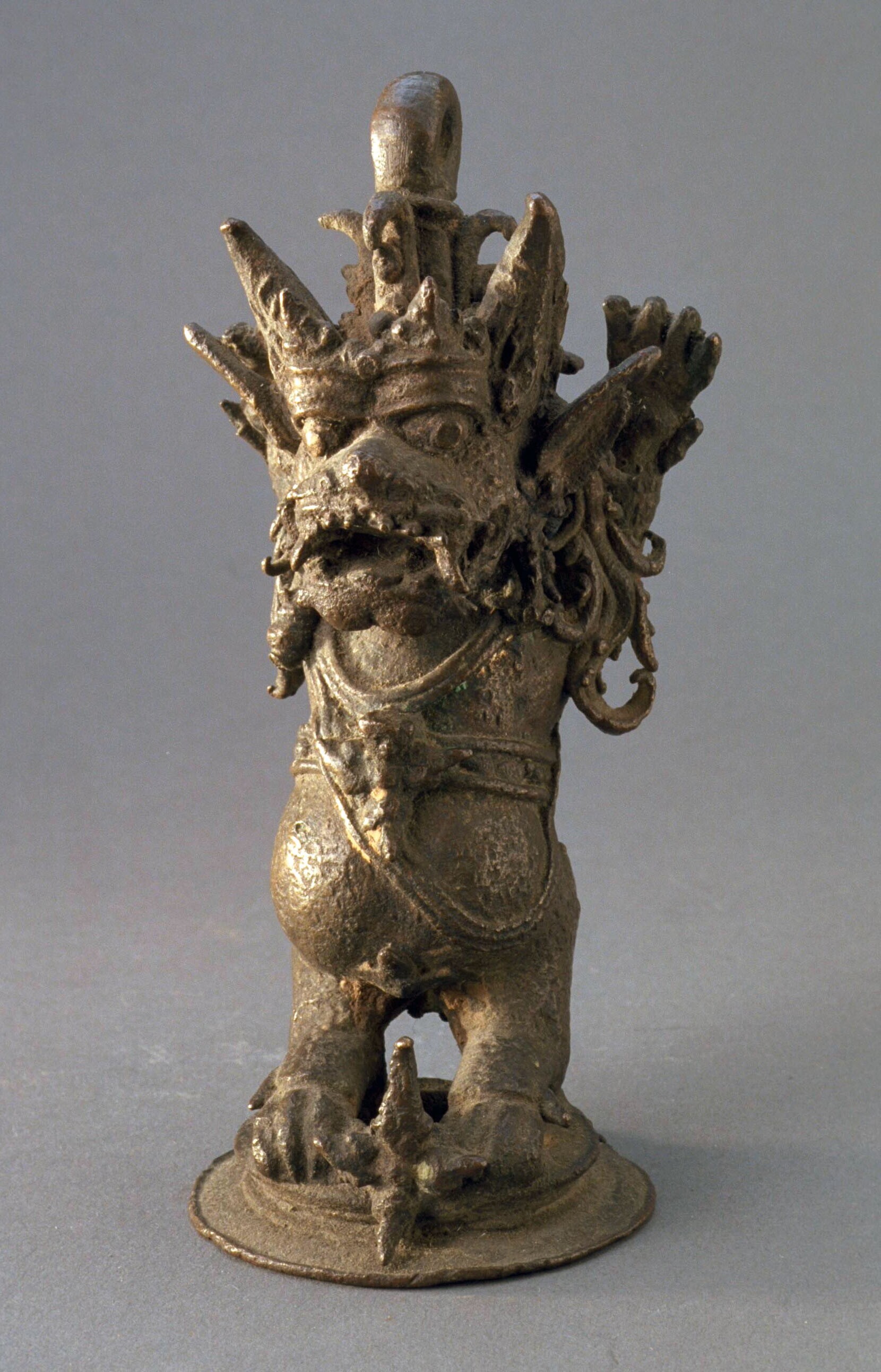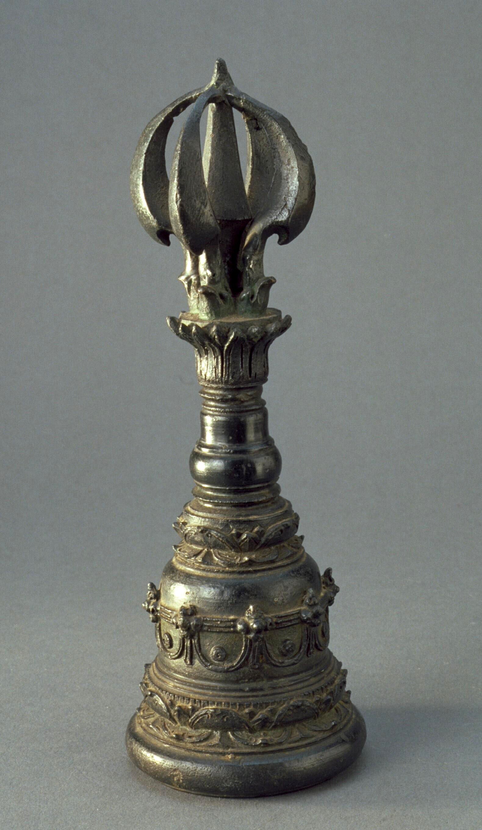 Topstuk van een tempelbel in de vorm van een op zijn...