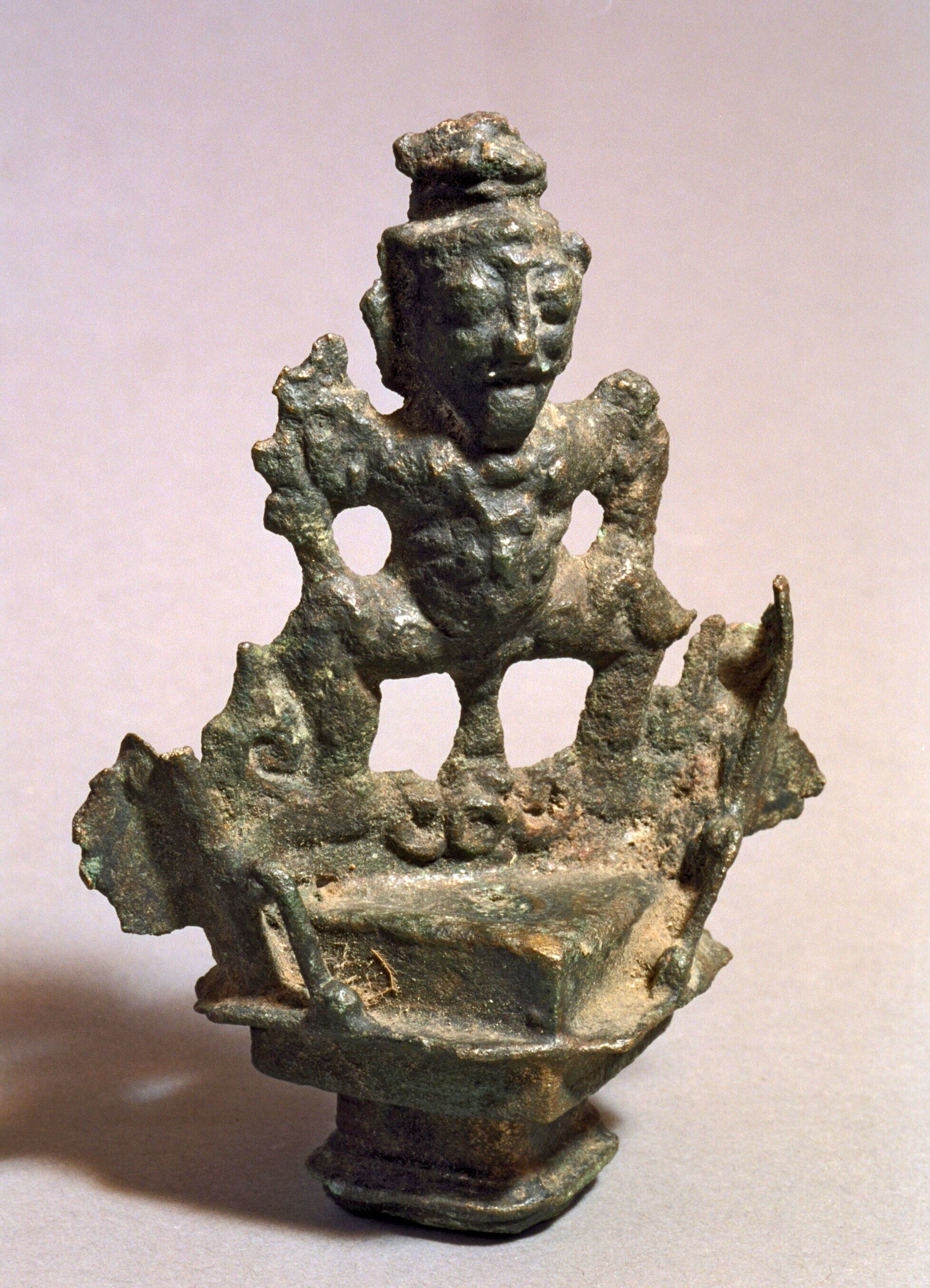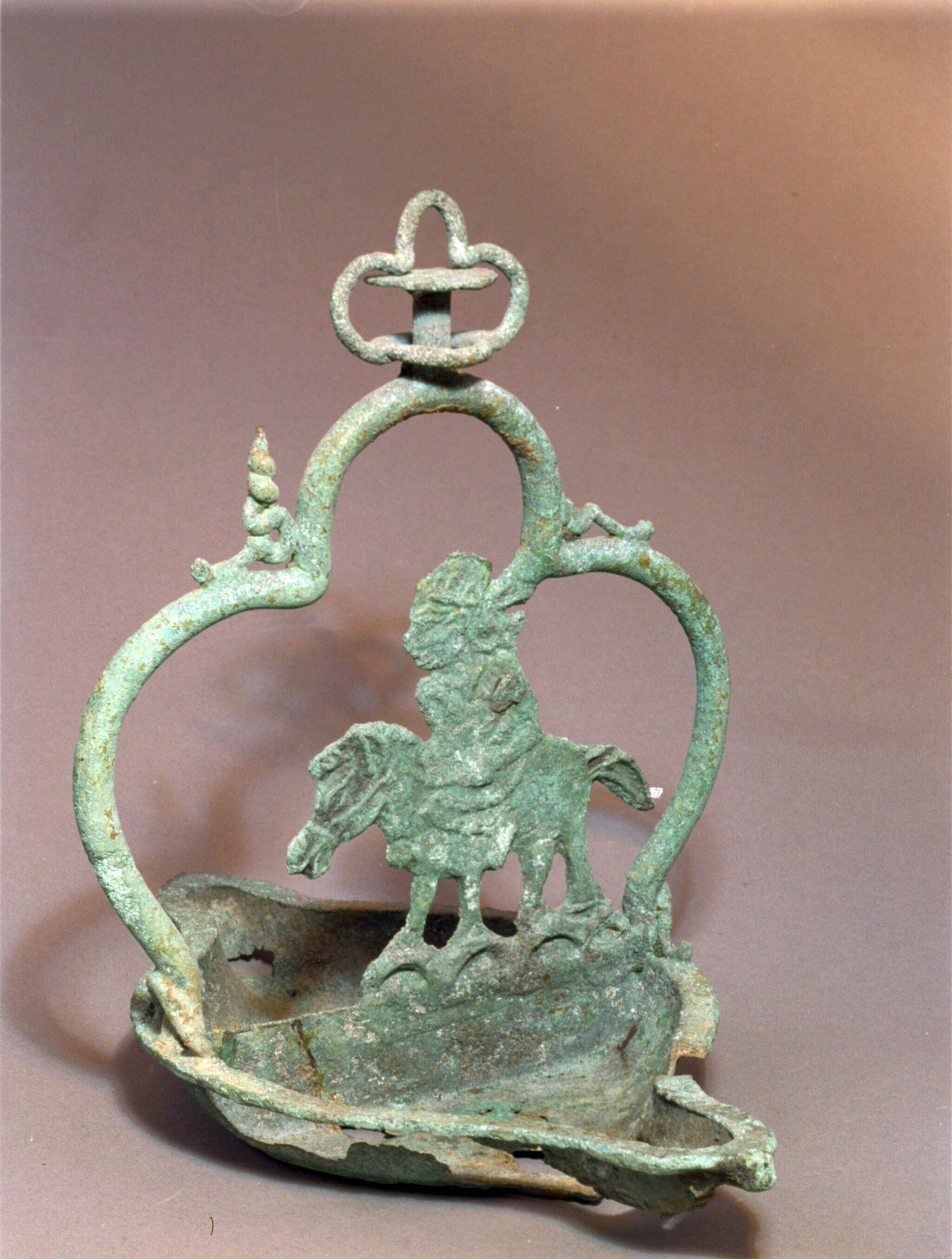 Sierstuk van een olielamp in de vorm van wijdbeens s...