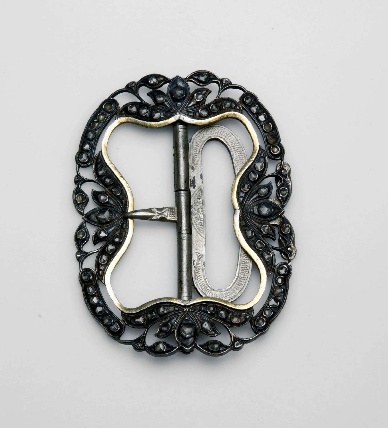 Smalle zilveren gesp met glasdiamantjes, behorend bi...