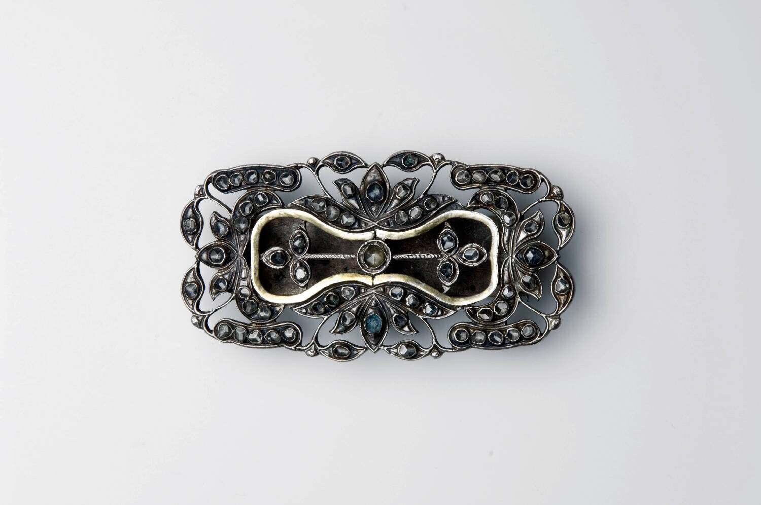 Brede zilveren gesp met glasdiamantjes, behorend bij...