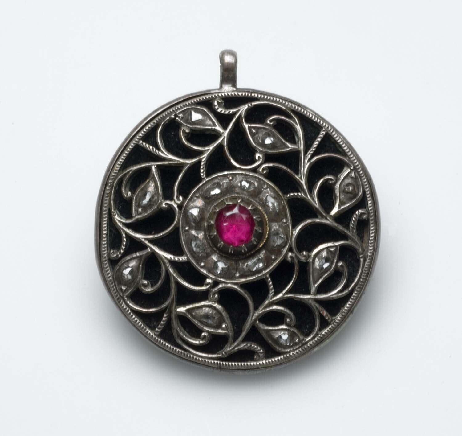 Ronde hanger van opengewerkt zilver, in het midden r...