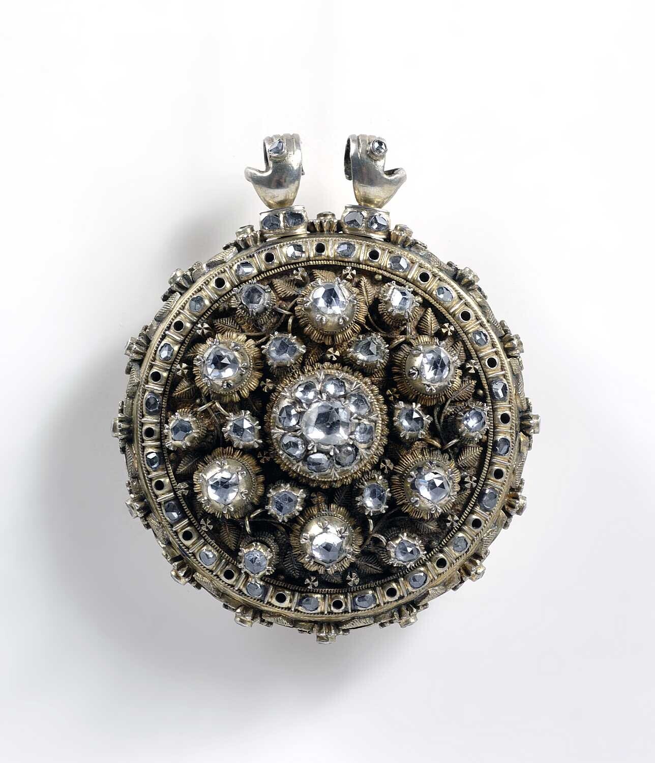 Ronde zilveren hanger met glasdiamantjes en twee han...