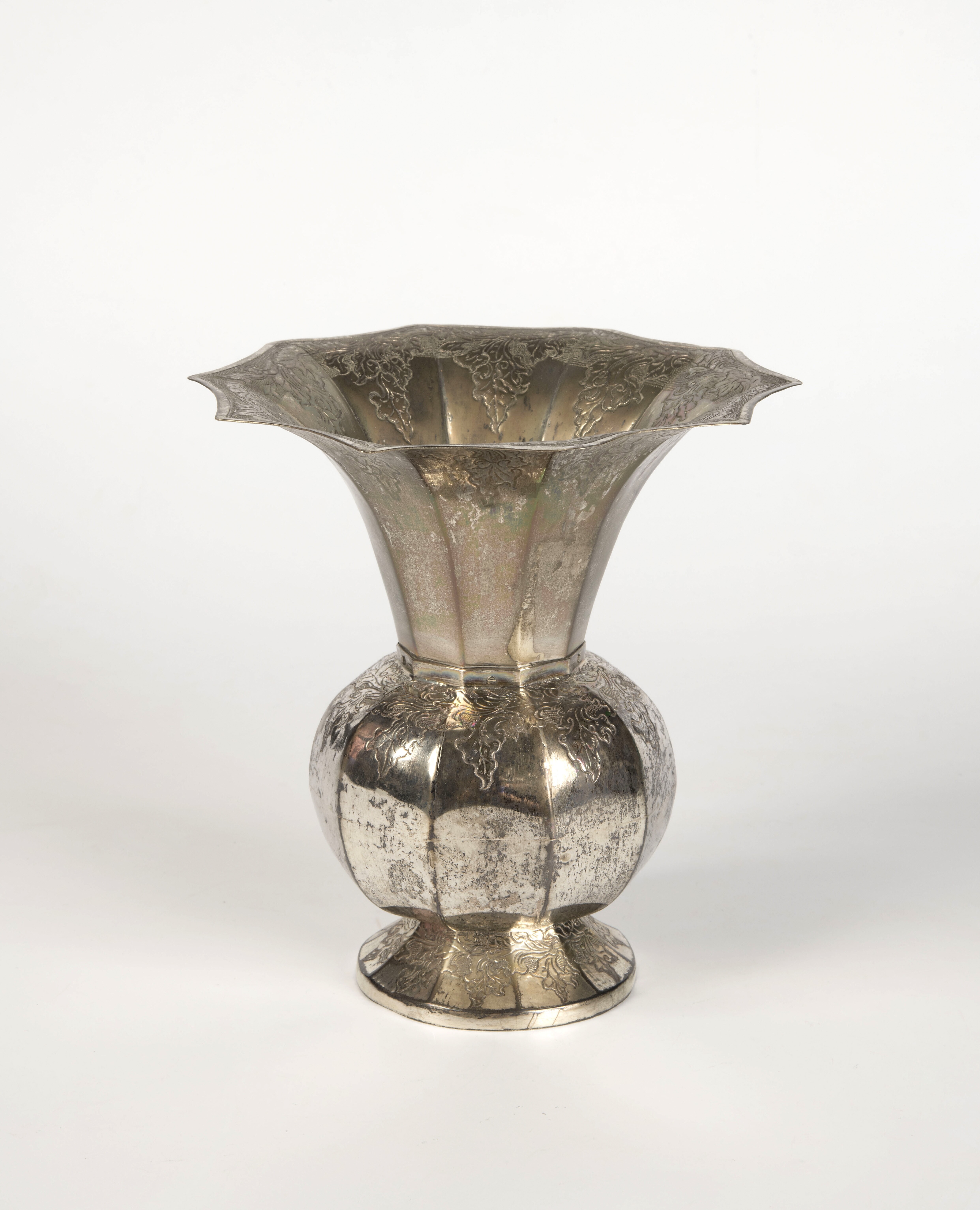 Kwispedoor van zilver, versierd met bladkrulornamenten